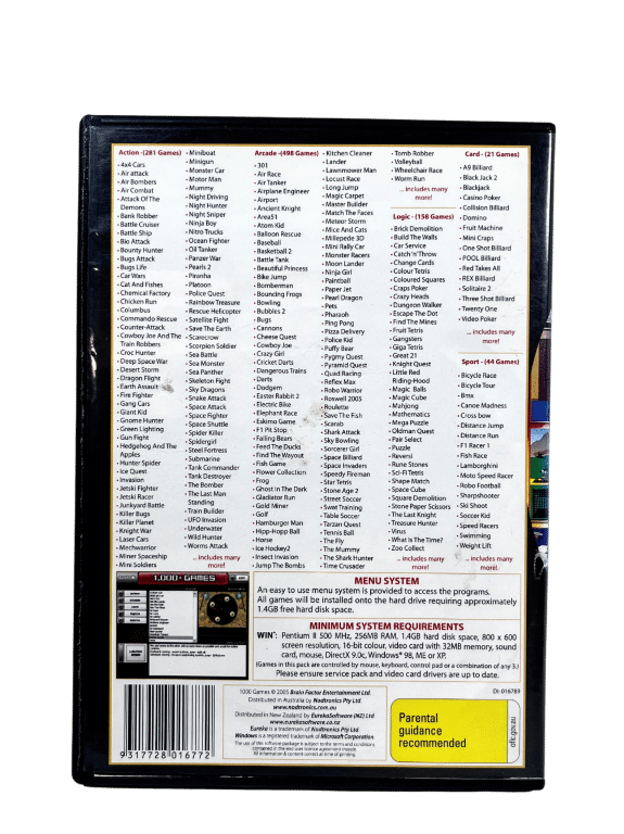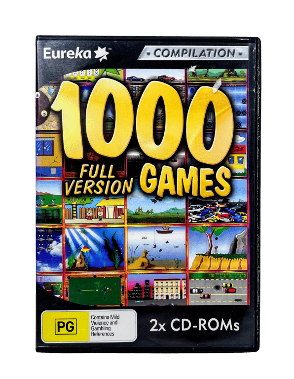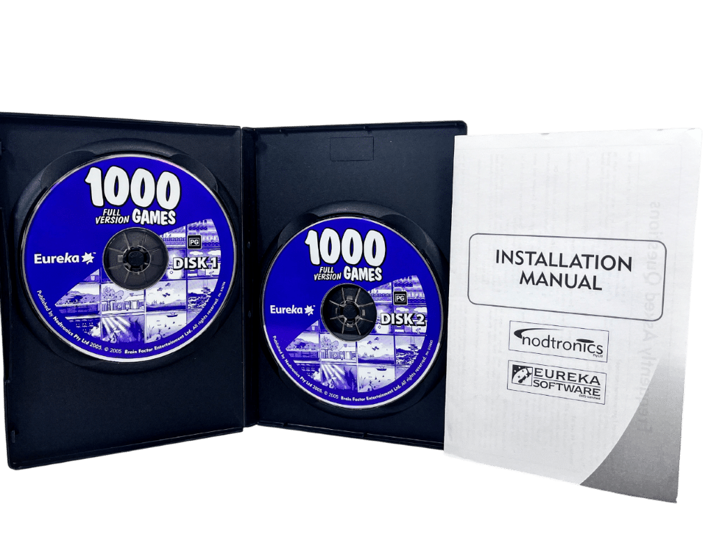 1000 GAMES FULL VERSION (with TWO game discs) for PC. This preowned games compilation is in excellent condition and comes complete with original case + insert card + 2 x game discs. As a preowned game, players will likely require a new keycode purchased online to activate the game once the discs are installed.