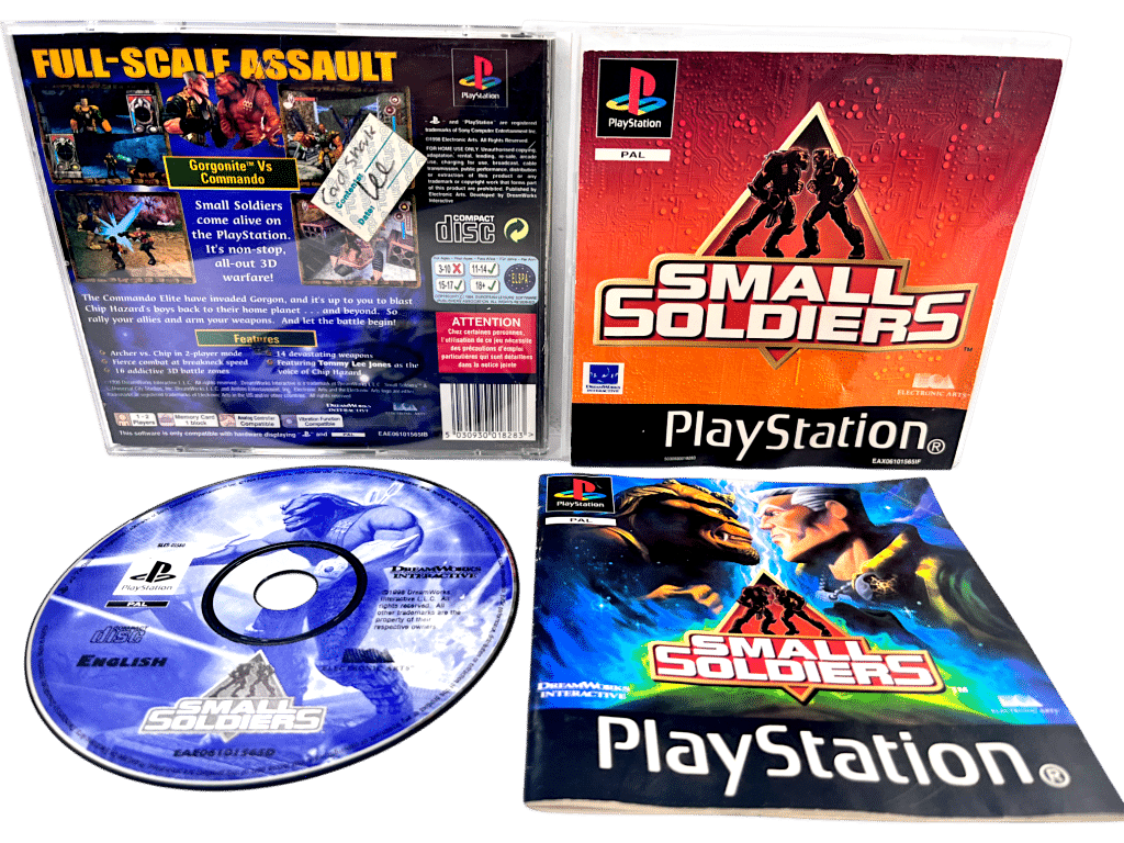 Excellent condition & 100% complete with contents: SMALL SOLDIERS for SONY PlayStation / PS1. This preowned game comes complete with case + covers (both front and back cover slips) + manual / booklet + game disc. Front plastic panel of case has a small plastic crack, but this is purely cosmetic, and all internal contents are superb.