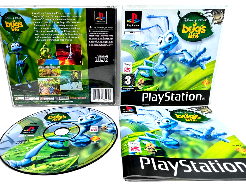 Based on the animated film, A Bug’s Life is an epic game of miniature proportions. The story follows the exciting adventures of a misfit ant named Flik as he tries to save his colony from a greedy gang of grasshoppers led by Hopper. As Flik, you travel through fully interactive 3D environments brought to life with cinematic quality animation, smooth controls, and challenging puzzles. Get ready for a bug’s-eye-view in an incredible and fast-paced adventure.(http://www.gamefaqs.com/ps/196524-disney-pixar-a-bugs-life)