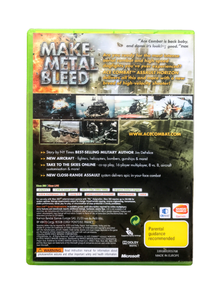 Excellent condition & 100% complete with contents: Ace Combat Assault Horizon for XBox 360. This preowned game is in superb condition and comes complete with case, cover, manual / booklet, and game disc. Case has some light laminate plastic wear, but this is purely cosmetic, and each of the internal contents are fantastic.
