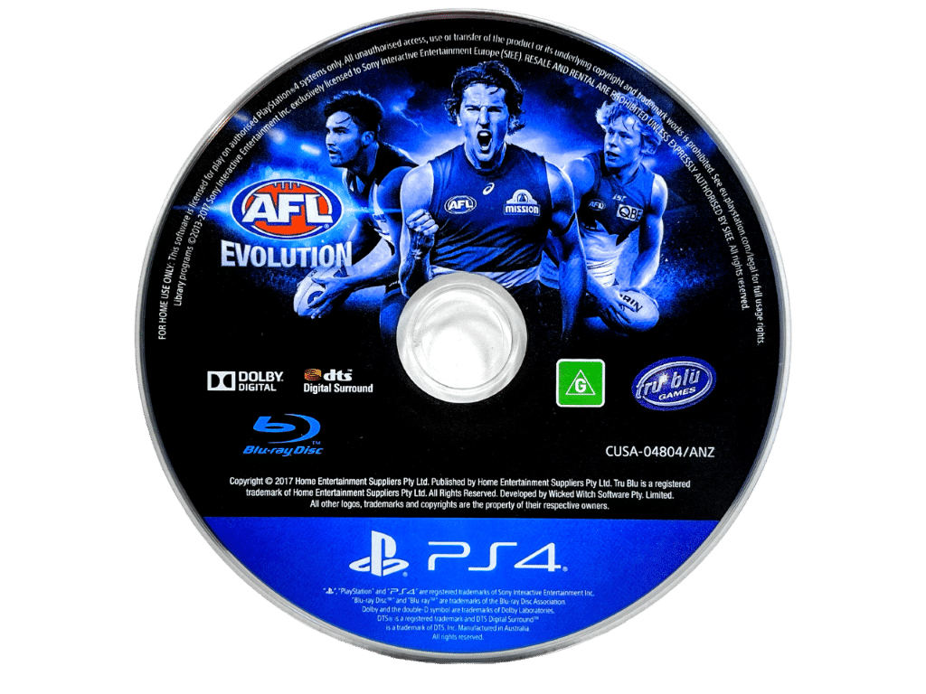 AUSTRALIAN FOOTBALL LEAGUE EVOLUTION / AUSTRALIAN RULES EVOLUTION / AUSSIE RULES EVOLUTION / AFL EVOLUTION for SONY PlayStation 4 / PS4. This preowned game is in excellent condition and comes complete with case + cover + manual / booklet + game disc. Top paper edge of cover has a thin line of paper fraying, but this is an extremely minor cosmetic imperfection only, and all other contents are superb.