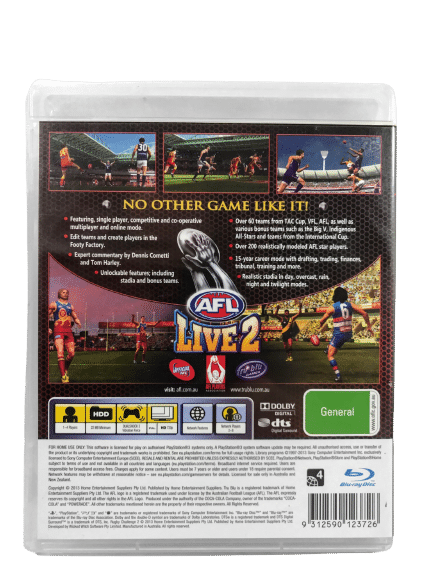 Excellent Condition & 100% complete with contents: AUSTRALIAN FOOTBALL LIVE 2 / AFL LIVE 2 / AUSSIE RULES 2 for SONY PlayStation 3 / PS3. This preowned game is in superb condition and comes complete with case, cover, manual / booklet, and game disc. Displays original price sticker on the front ($69.36!).