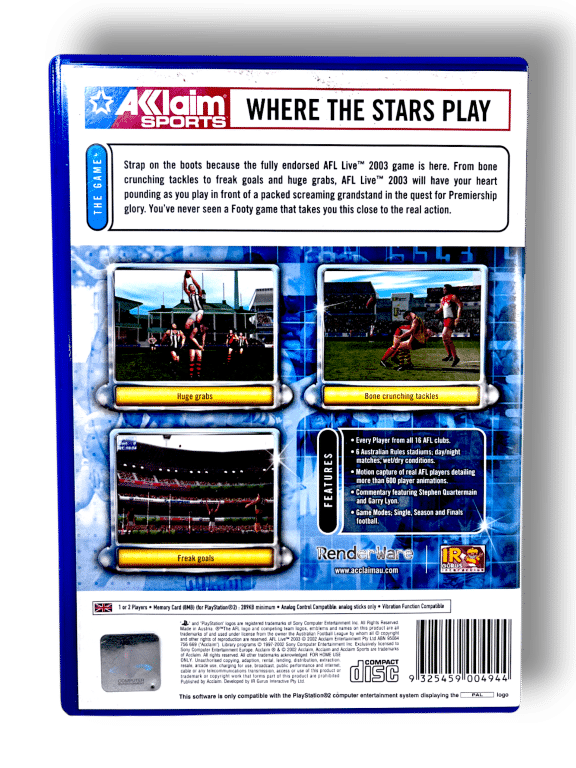 Game Description AFL Live 2003 is a sports title that simulates the Australian Football League. The game was released to coincide with the 2003 AFL season and features all 16 official teams and their respective players from that time. It aims to provide a realistic and immersive experience, with a focus on the fast-paced, high-contact gameplay of Australian Rules Football. Players can take part in a single match, a full season, or a finals series, and the game includes detailed statistics and commentary to enhance the broadcast-style presentation.
