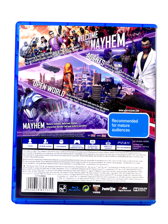 Agents of Mayhem DAY ONE EDITION for SONY PlayStation 4 / PS4. This preowned game is in excellent condition and comes complete with case + cover + carded insert + game disc.Â