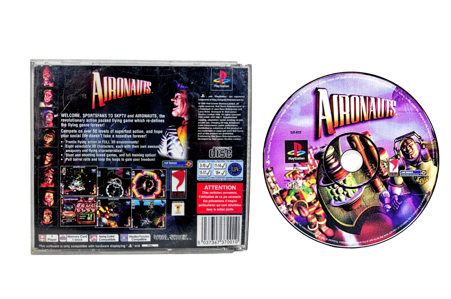 Aironauts SONY PlayStation Game / PS1 This preowned game includes case + reverse cover + game disc. Does NOT include front cover slip, manual, or front plastic panel of case. Game disc in good condition with only light superficial markings and imperfections which do not hinder performance or game play in any way. One of the scarcer original Sony PlayStation sports games.