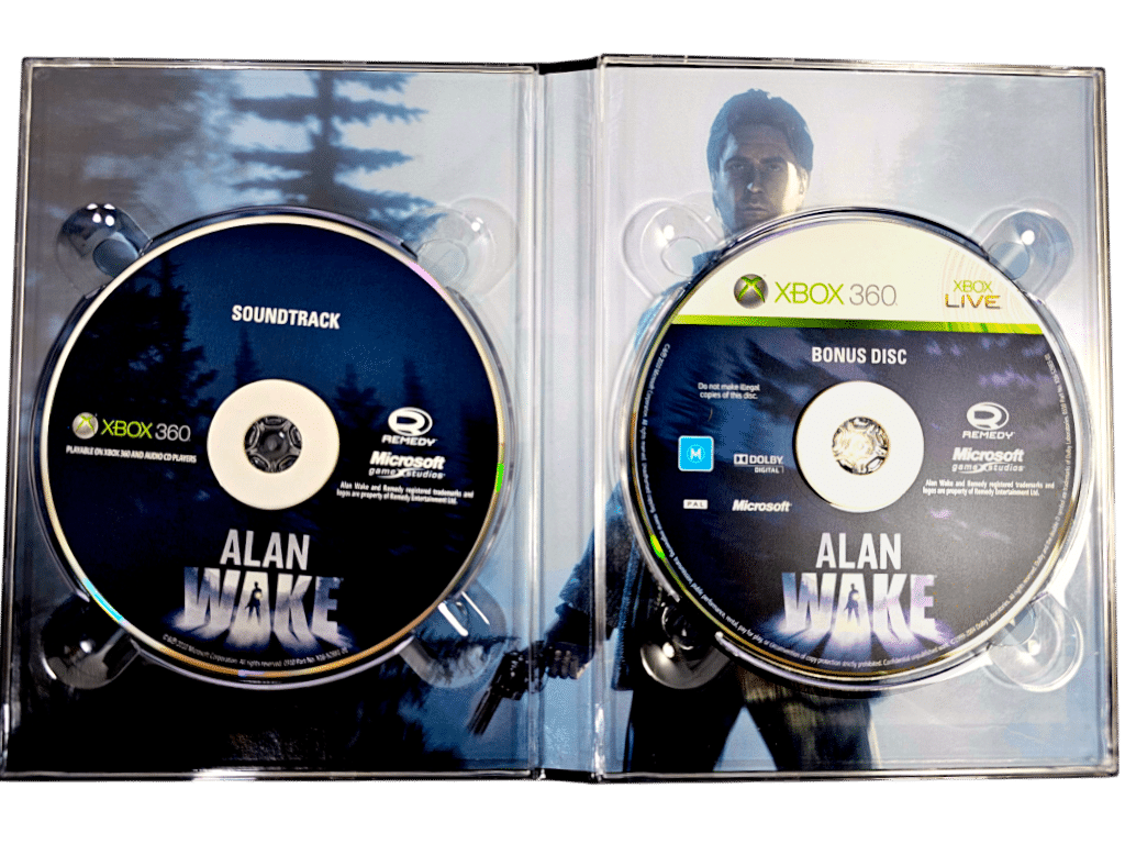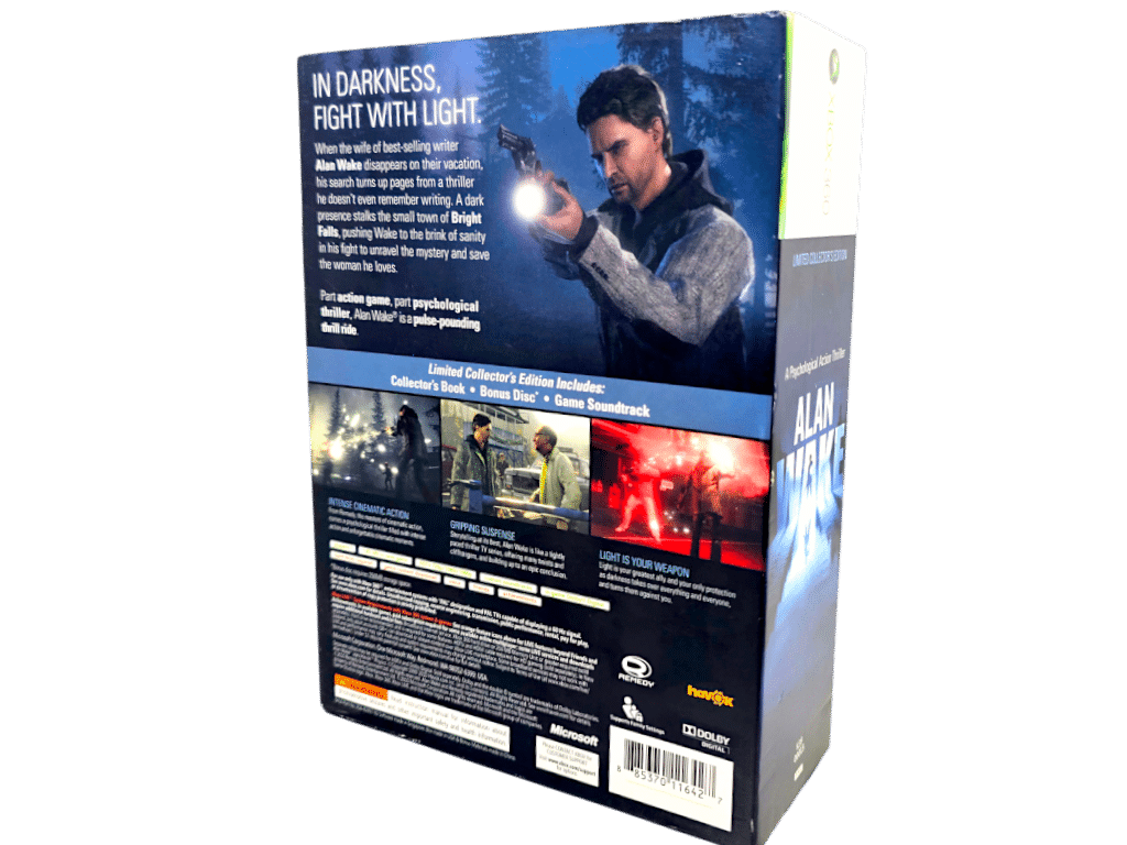 Rare Find: MINT Condition & 100% Complete with Contents: Big Box Alan Wake Limited Collector’s Edition for Xbox 360. This preowned authentic Limited Release is a large collector’s boxed bundle – in pristine condition. This was traded in to our store by a former game store owner, who received pre-releases and limited editions during his tenure in gaming retail. This collector recently traded in a large portion of his entire gaming collection, and this Limited Alan Wake release was part of that collection.