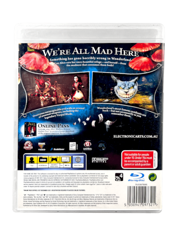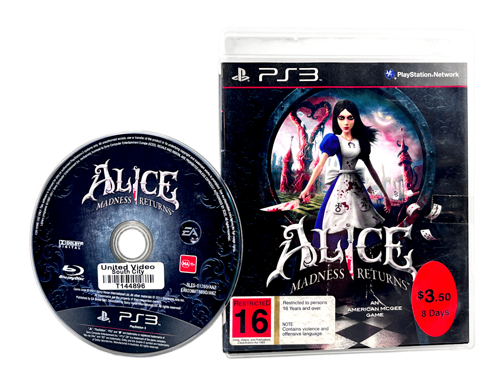 ALICE MADNESS RETURNS for SONY PlayStation 3 / PS3. This preowned game is in excellent condition and includes pictured case + cover + game disc. Ex rental game which has been very well cared for.