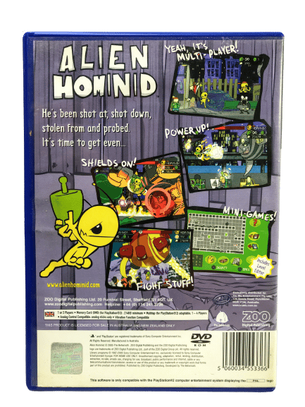 RARE & collectible PS2 Game: ALIEN HOMINID for SONY PlayStation 2 / PS2. Very good condition, complete with case, cover, manual / booklet, and game disc. Some very fine superficial markings / cosmetic scratches, but these are minor imperfections which do not affect game play in any way.