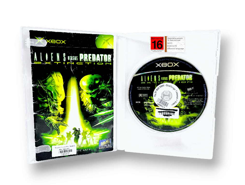 Aliens vs Predator: Extinction (Original Xbox). This pre-owned Original Xbox game includes both the manual and game disc inside pictured clear case. Please note that the original cover is not included. The manual has some paper creasing in the discs, some very light scratches. Neither of these cosmetic imperfections affects gameplay or performance.