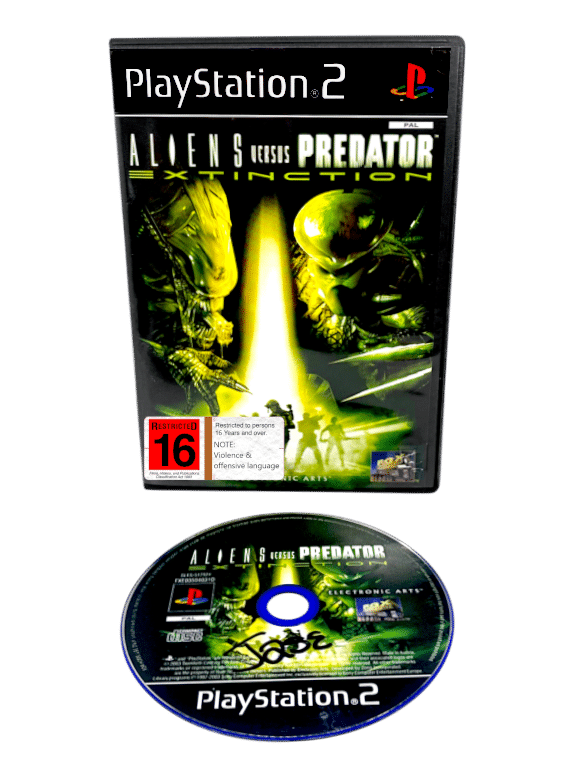Aliens vs Predator Extinction (PS2). This preowned SONY PlayStation 2 game (PS2 game) is in good condition and includes pictured case + game disc + contents.