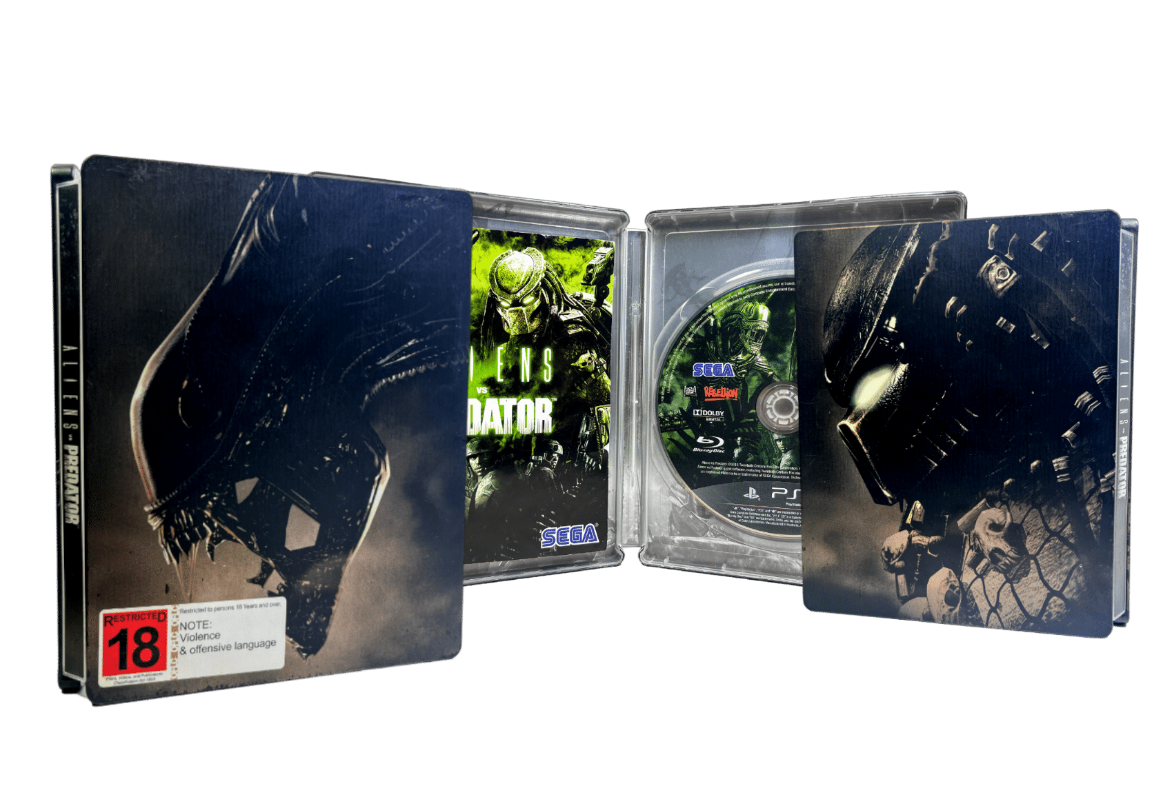 RARE LIMITED STEEL CASE COLLECTOR’S EDITION: ALIENS vs. PREDATOR STEEL EDITION / Aliens Versus Predator STEEL EDITION for SONY PlayStation 3 / PS3. This preowned authentic limited Steelbook Collector’s Edition is in superb condition with mild aging spots only, and includes complete with case, cover, manual / booklet, and game disc. A lovely collector’s limited edition. Refer photographs.