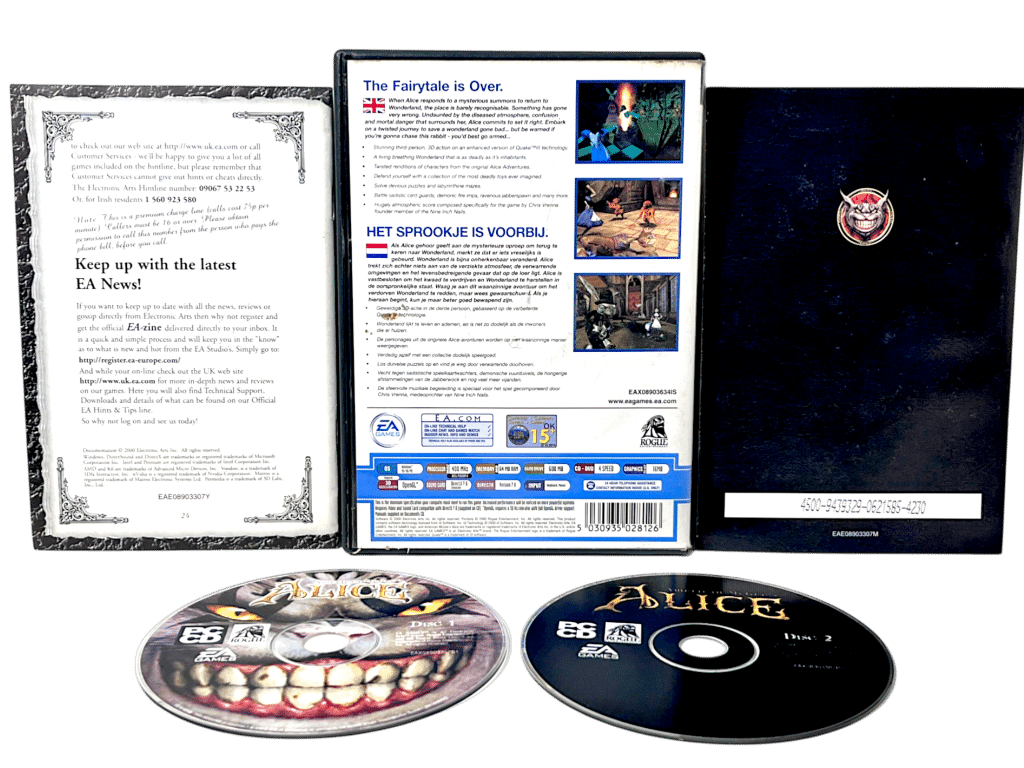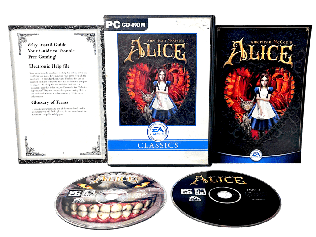DESCRIPTION: American McGee’s Alice is a cult-classic PC action-adventure reimagining Lewis Carroll’s tale in a dark gothic style. This EA Classics edition includes original discs and manual. Known for atmospheric design and psychological storytelling, it remains highly regarded among PC collectors.