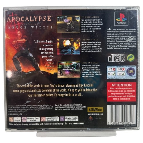 Apocalypse for SONY Playstation 1 / PS1. This preowned game listing comes with original case, manual / booklet and game disc. No front paper cover included in listing.