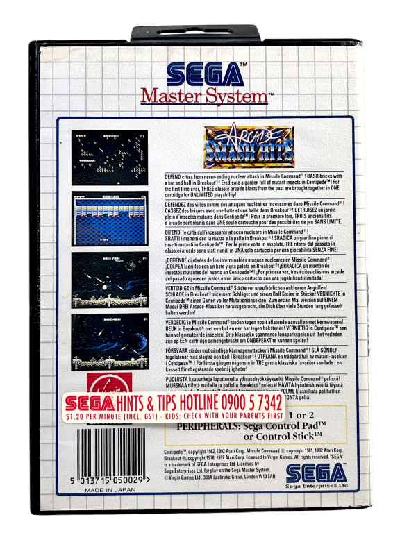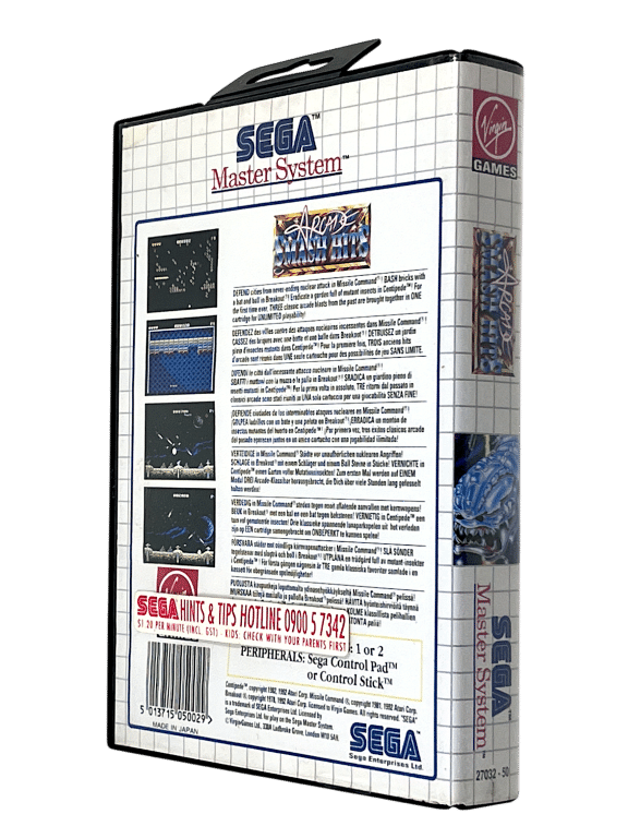 Arcade Smash Hits is a video game compilation of published by Virgin Games in 1992 for the Master System. It is a compilation of three games in one cartridge, all of which were originally released in arcades by Atari, Inc. The games are Breakout (1976), Centipede (1980), and Missile Command (1980).