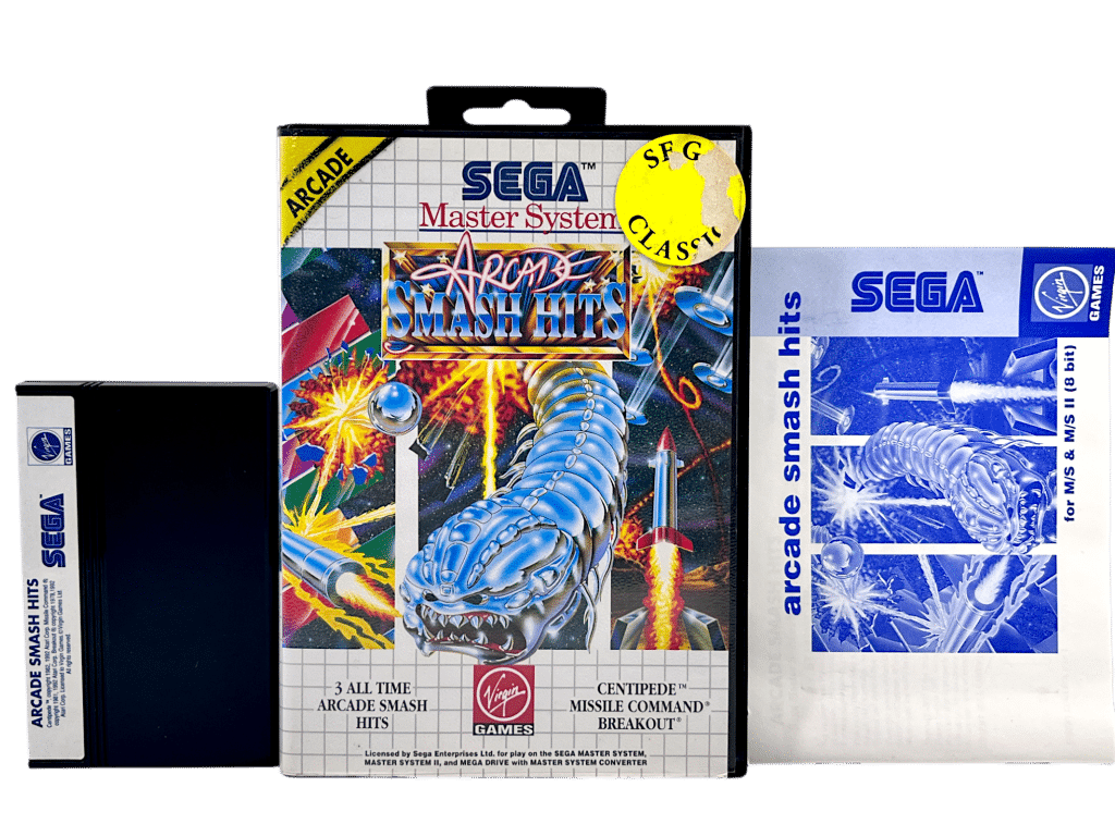Excellent condition & 100% complete with contents: ARCADE SMASH HITS for Sega Master System. This preowned game is in superb condition and comes complete with case + cover + manual / booklet + game cartridge. Refer photographs.