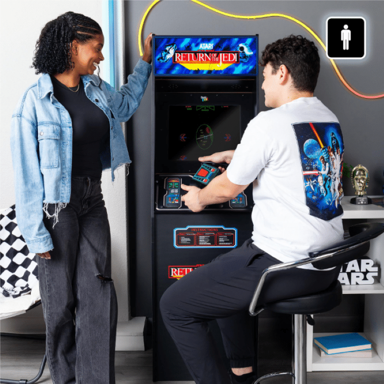Back by popular demand! The special 40th anniversary edition of The Star Wars™ Home Arcade Game features artwork from the original arcade machine that flows seamlessly from the cabinet to the included riser. The just over 5’ tall machine (with riser) comes with a lit molded coin door, light up marquee, full-color 17” display and dual speakers. These features, combined with the real-feel flight yoke and control buttons allow for endless hours of gaming! The Star Wars™ Home Arcade Game is easy to assemble. (Force Powers not required)