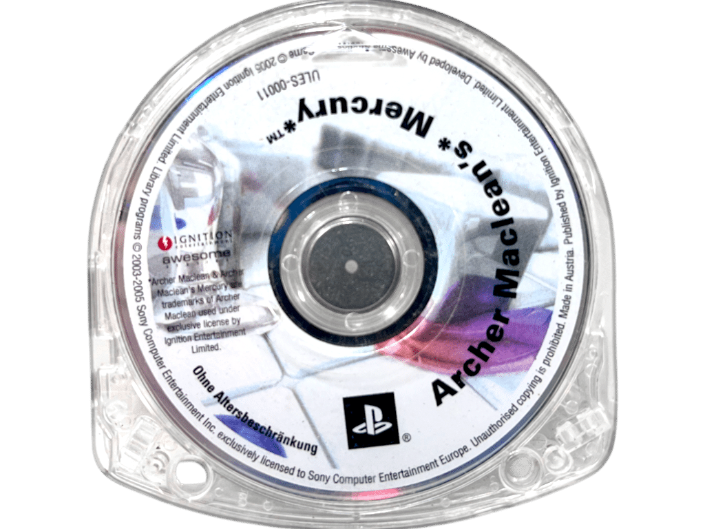 Archer Maclean’s Mercury for SONY PSP / PlayStation Portable. This preowned game disc is in good condition and comes inside its miniature UMD case. PLEASE NOTE THAT THE GAME CASE IS NOT INCLUDED.