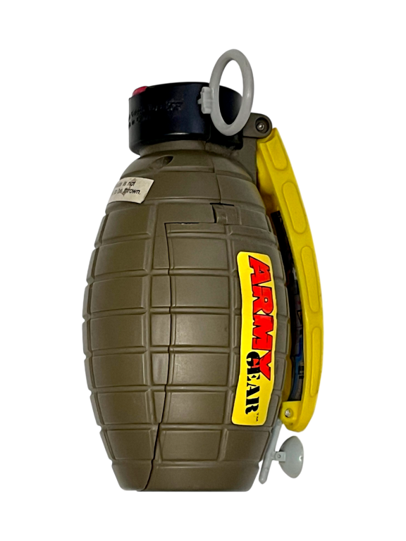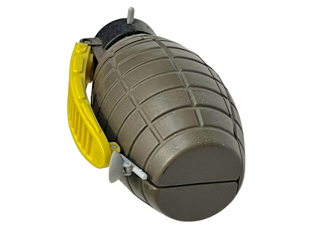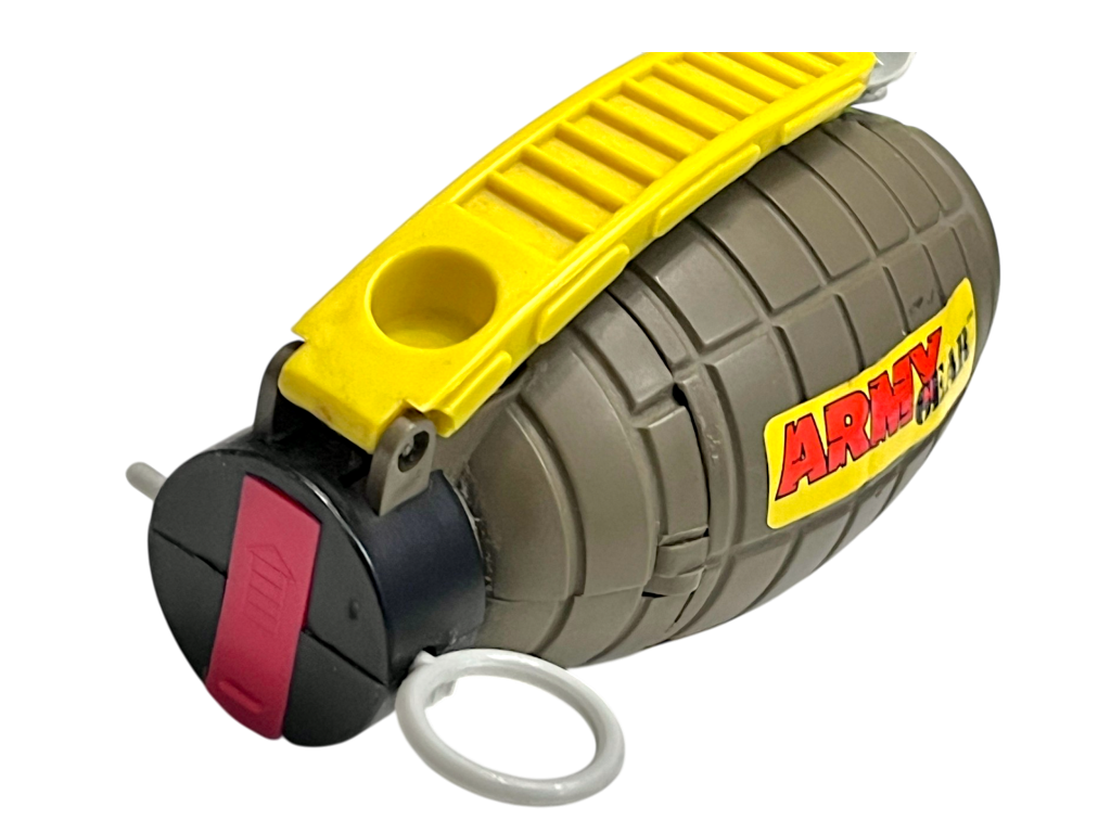 DESCRIPTION: This Army Gear toy grenade is a novelty prop styled after a military hand grenade, commonly included with toy soldier sets and action figure accessories. The plastic design features a textured body and pull-style handle that mimics the look of real military equipment while remaining a harmless toy accessory. Items like this are often used in imaginative play scenarios involving toy soldiers, action figures or military vehicles. The rugged styling and detailed moulding make it an interesting prop piece for collectors of vintage toy military accessories. While not functional in any mechanical sense, it serves as a themed accessory that adds realism to toy battle or adventure play setups.