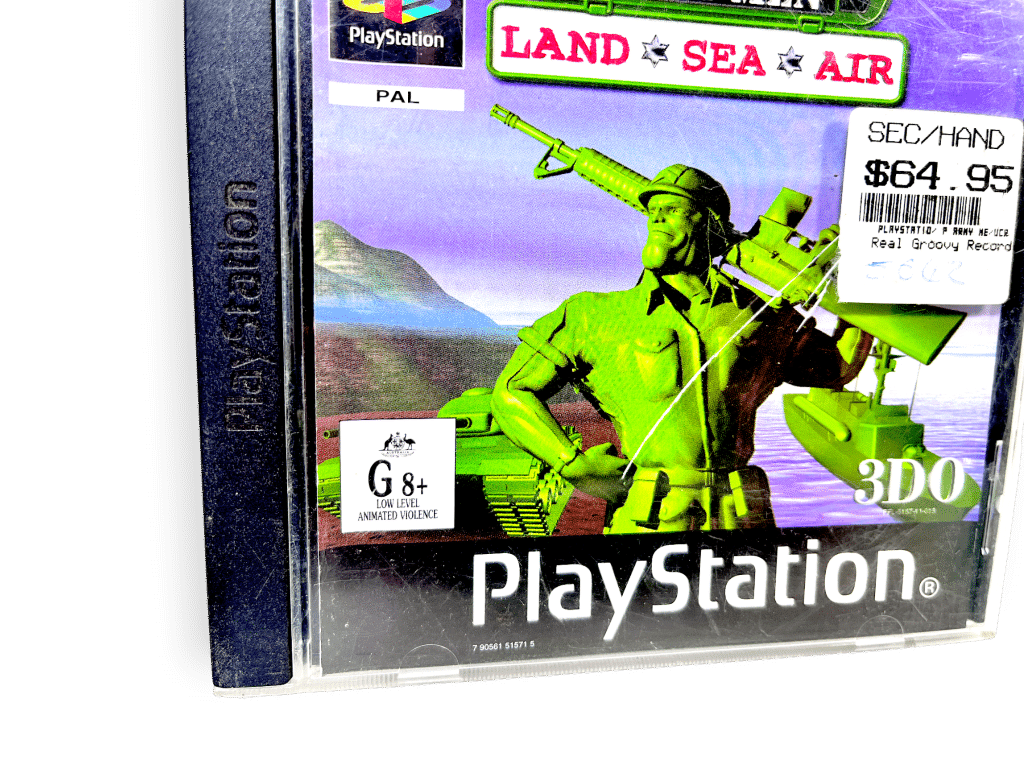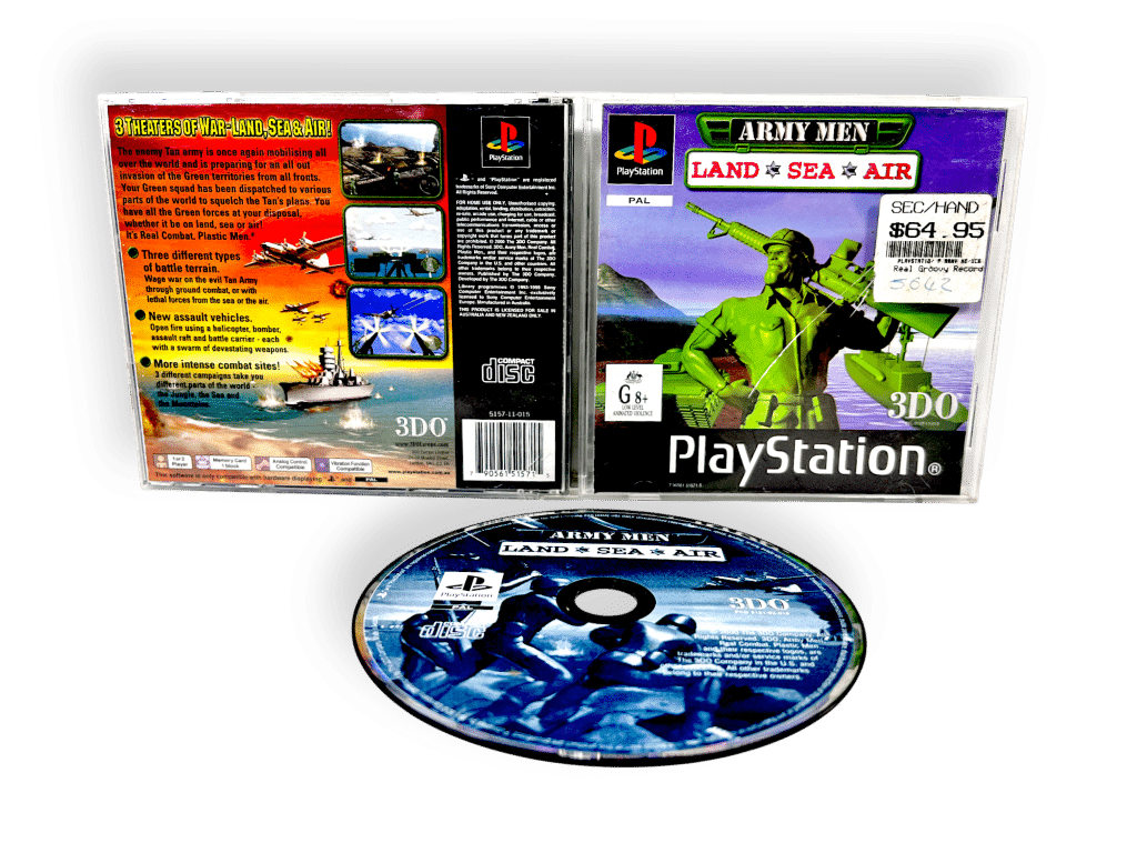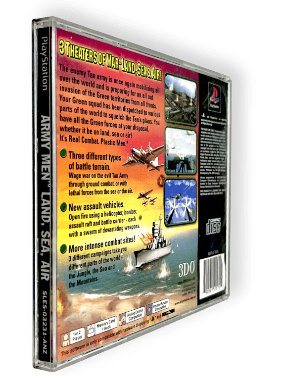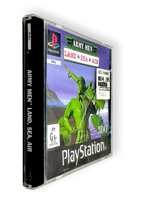56. Army Men: Land, Sea, Air (PS1). This preowned SONY PlayStation game is in good condition and includes original case + cover + game disc. Manual not included. Front plastic panel has a small plastric crack, but this is purely cosmetic and does not affect functionailty in any way.