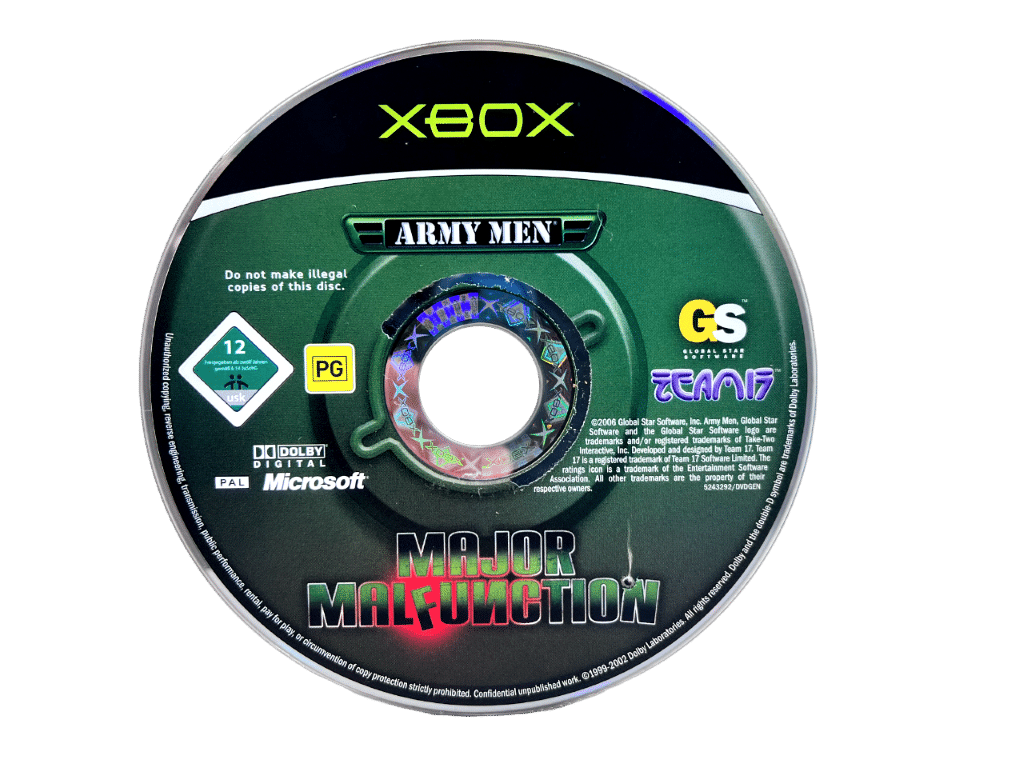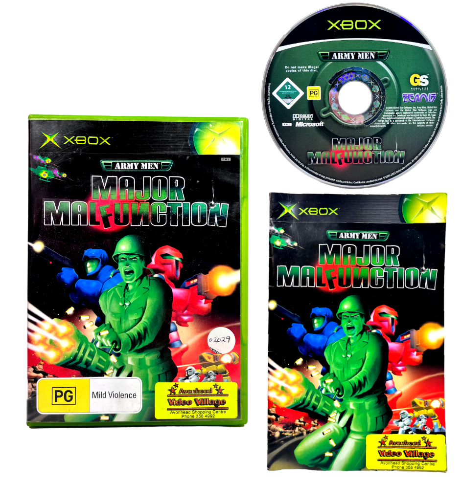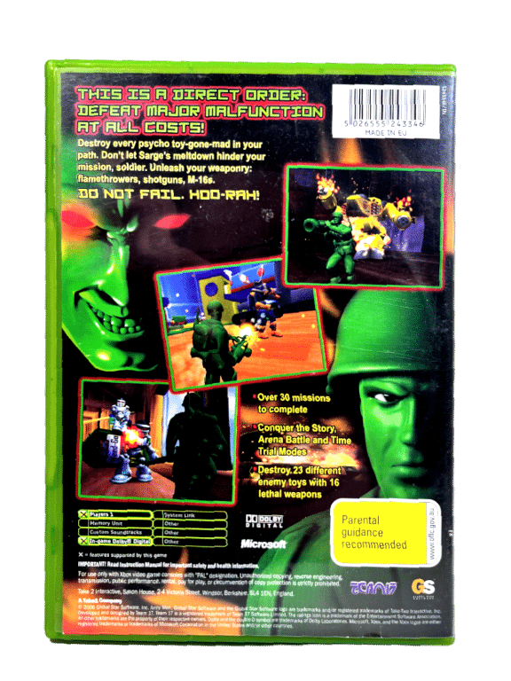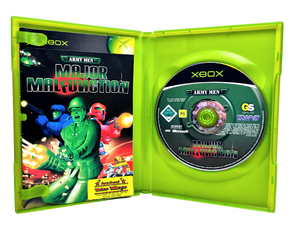 One of the rarest PG rated PAL Region games available for the Original Xbox (and this a Genuine NZ Print): ARMY MEN MAJOR MALFUNCTION. This preowned game is in very good comes complete with case + authentic New Zealand cover (with the signature “PG” classification embedded in the cover art and on the game disc) + manual / booklet + game disc. Some faint superficial markings / ghost scratches, but these are purely cosmetic imperfections which do not affect game play in any way. The game disc and all contents are in very tidy condition as pictured. PAL region – to play perfectly in NZ consoles. This the only available PAL region version of this game either on EBAY (world market) or on Trade Me at time of listing. A genuinely rare and collectible Xbox game.