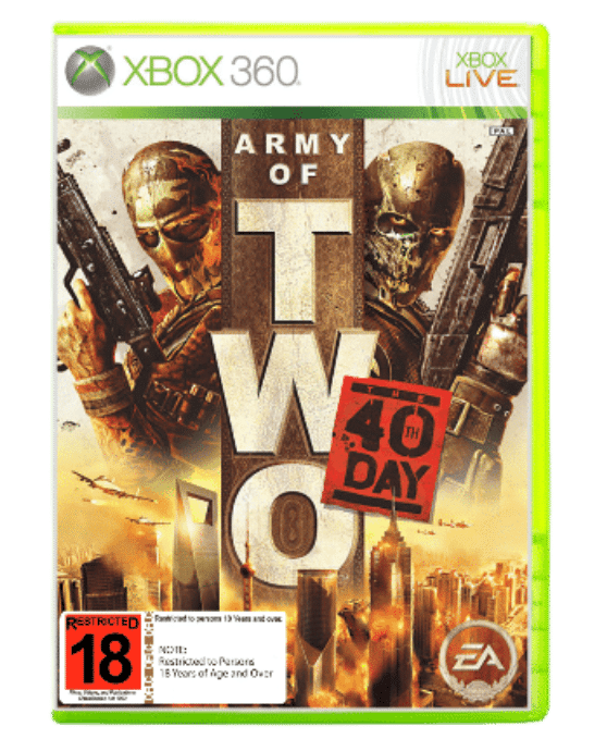 Good condition & 100% complete with contents: ARMY OF TWO: THE 40TH DAY for XBox 360. This preowned game comes complete with cover, manual / booklet, and game disc – each in excellent condition. Case has some laminate plastic damage, but the contents inside are superb.