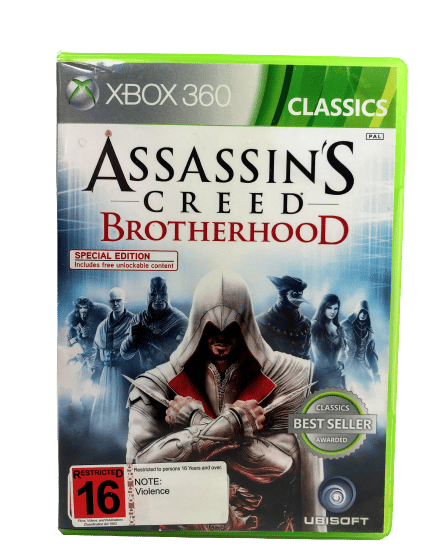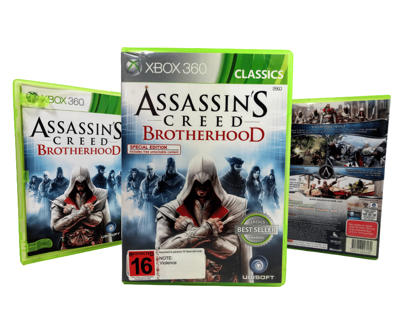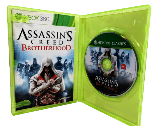 Authentic Classics Edition in Excellent Condition & 100% complete with contents: ASSASSINS CREED BROTHERHOOD for Xbox 360 (and this game also plays on XBox One). This preowned game is in superb condition, and comes complete with Genuine Classics Edition Xbox 360 case, cover, manual / booklet, promo card, and game disc.