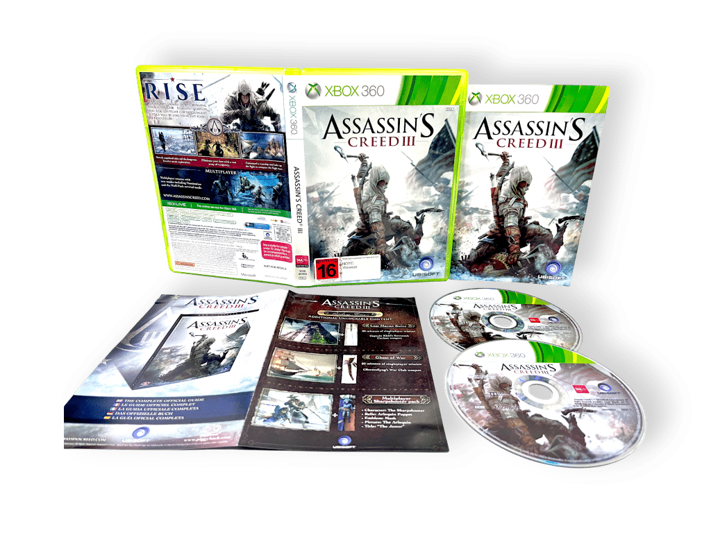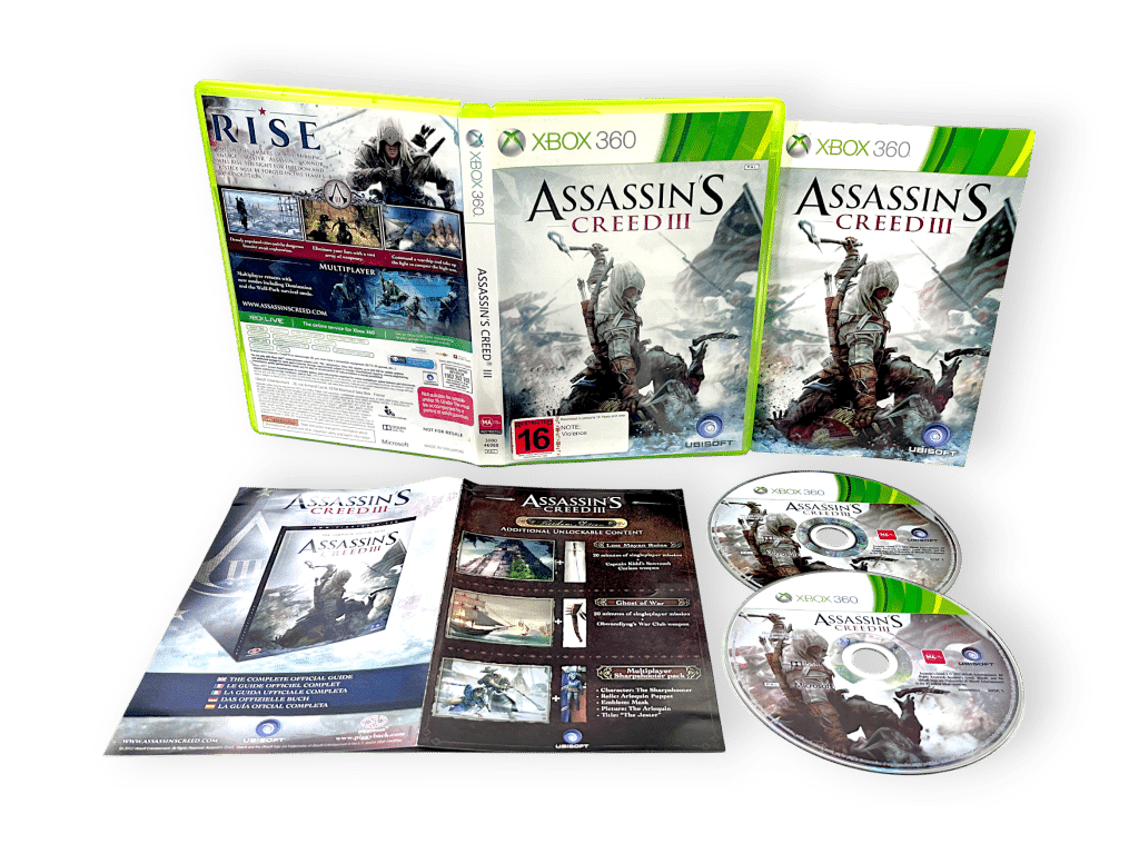 GENUINE ORIGINAL PRINT (NON “SPECIAL EDITION” COVER) IN excellent condition & 100% complete with contents: ASSASSIN’S CREED 3 For XBox 360. This preowned game is in superb condition, and comes complete with genuine unstamped cover, manual / booklet, and game discs. Manual has some light paper creasing, but this is purely cosmetic. Refer photographs.