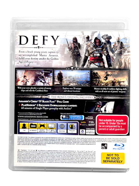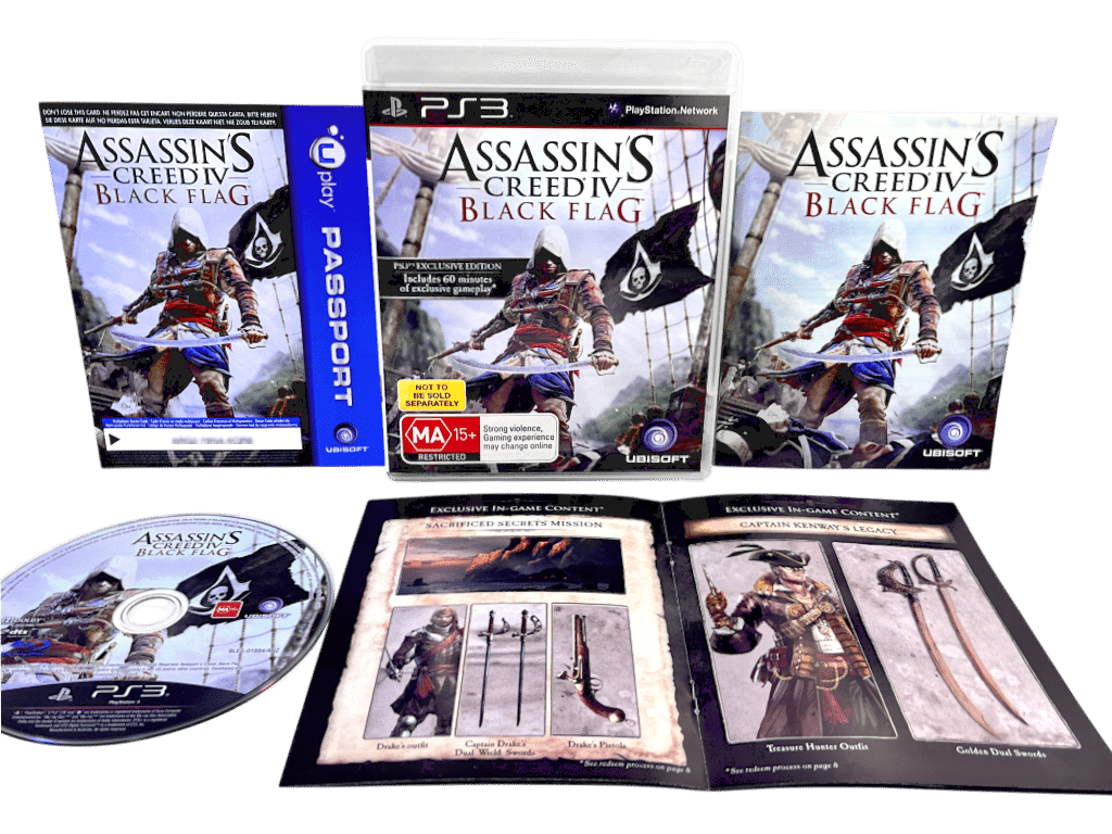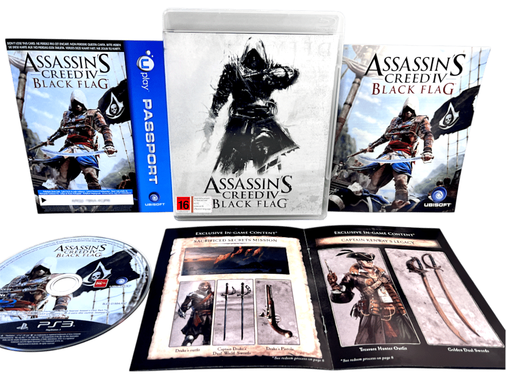 LIMITED EDITION in Excellent condition and 100% complete with contents: ASSASSINS CREED IV BLACK FLAG / Assassin’s Creed Black Flag for SONY PlayStation 3 / PS3. This preowned game is in pristine condition and comes complete with case, Genuine Double-Sided Limited Release cover (with the signature, “Not to be sold separately” embedded in the cover art both front and back), manual / booklet, internal leaflets / booklets, and game disc. A tidy and complete collector’s item. Refer photographs.
