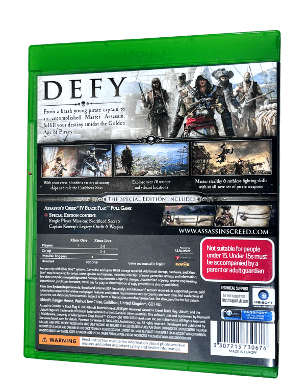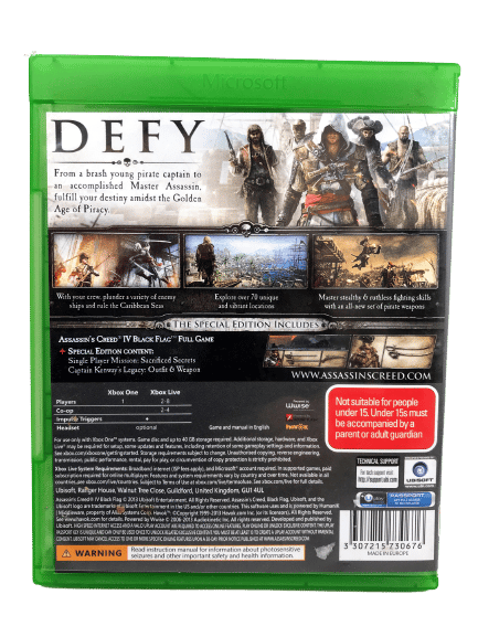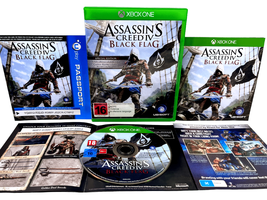 Official XBox One Edition in Mint Condition & Complete with Manual: ASSASSINS CREED BLACK FLAG / Assassin’s Creed 4 Black Flag for XBox One. This preowned game is in pristine condition and comes complete with case, cover, manual / booklet, and game disc. A very tidy and complete collector’s item.