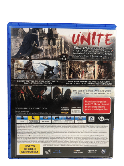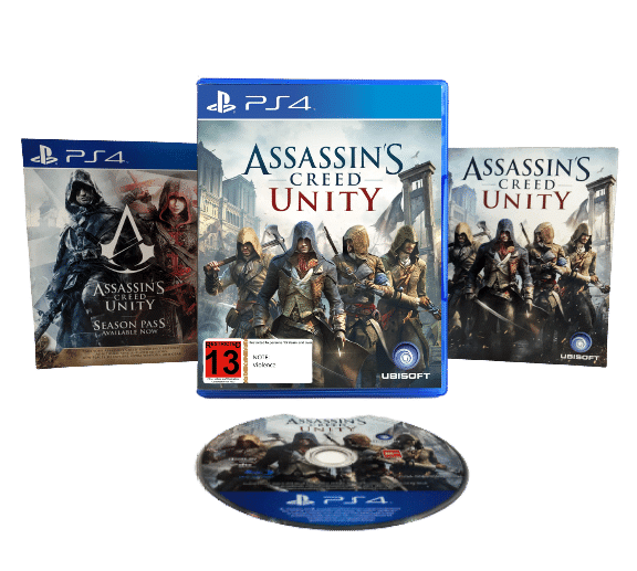ASSASSINS CREED UNITY for SONY PlayStation 4 / PS4. This pre-owned game is in excellent condition and complete with original case, cover, booklets, and game disc.