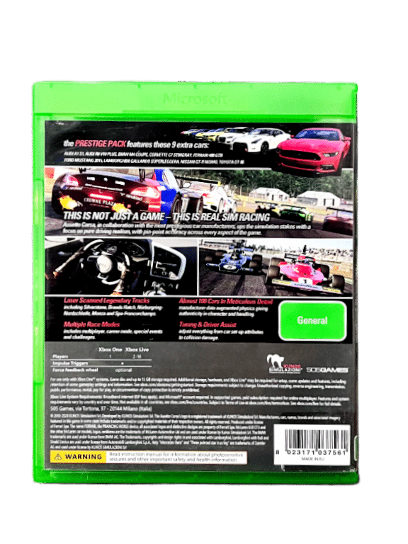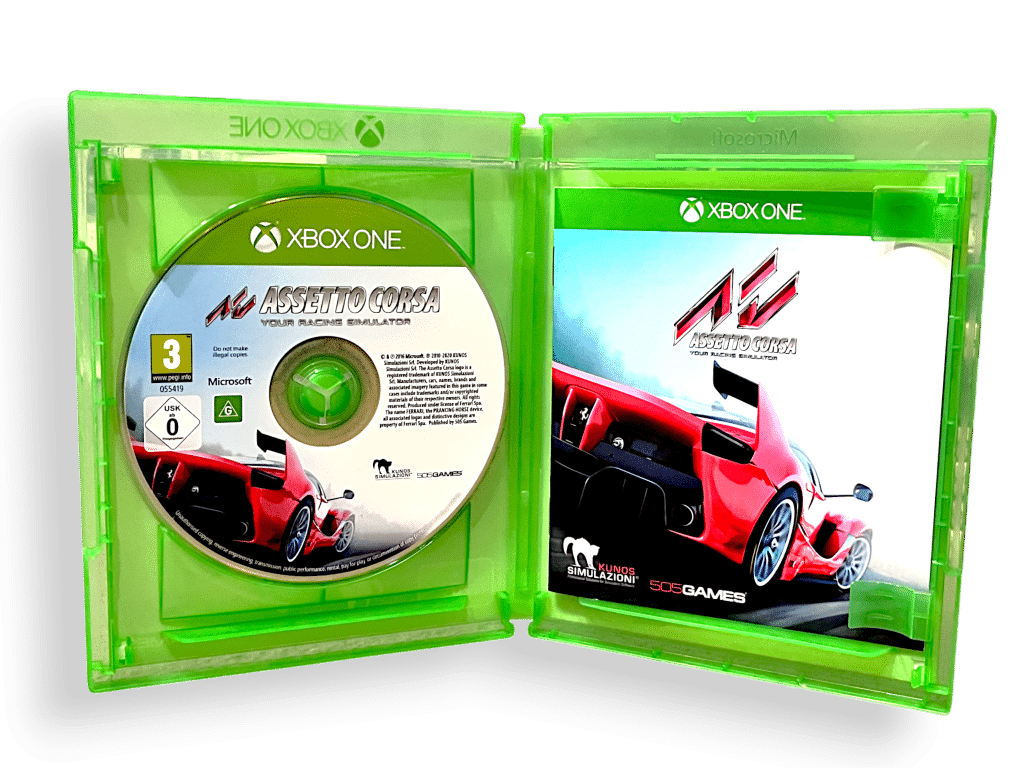 Excellent condition & 100% complete with contents: ASSETTO CORSA for XBox One. This preowned game is in superb condition and comes complete with case, cover, manual / booklet, and game disc. A tidy and complete collector’s item. Note that any single-use paper vouchers are not included here, but these were promotional downloads only and are not required for gameplay or completion. The full Assetto Corsa game is contained on the included game disc.