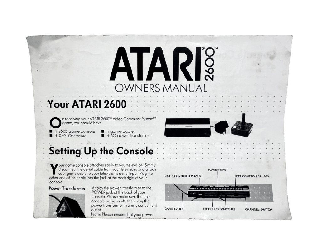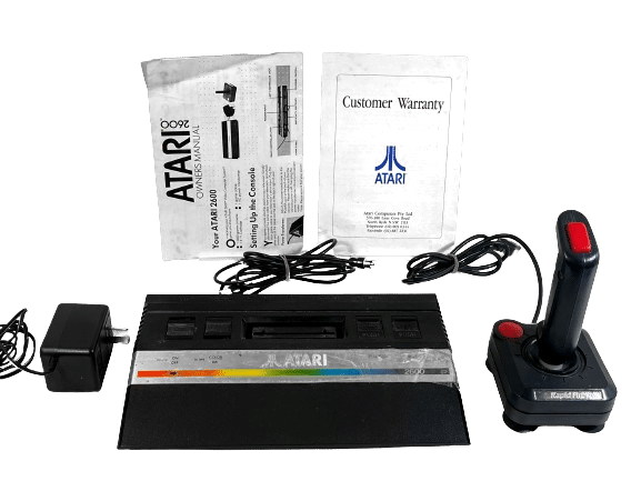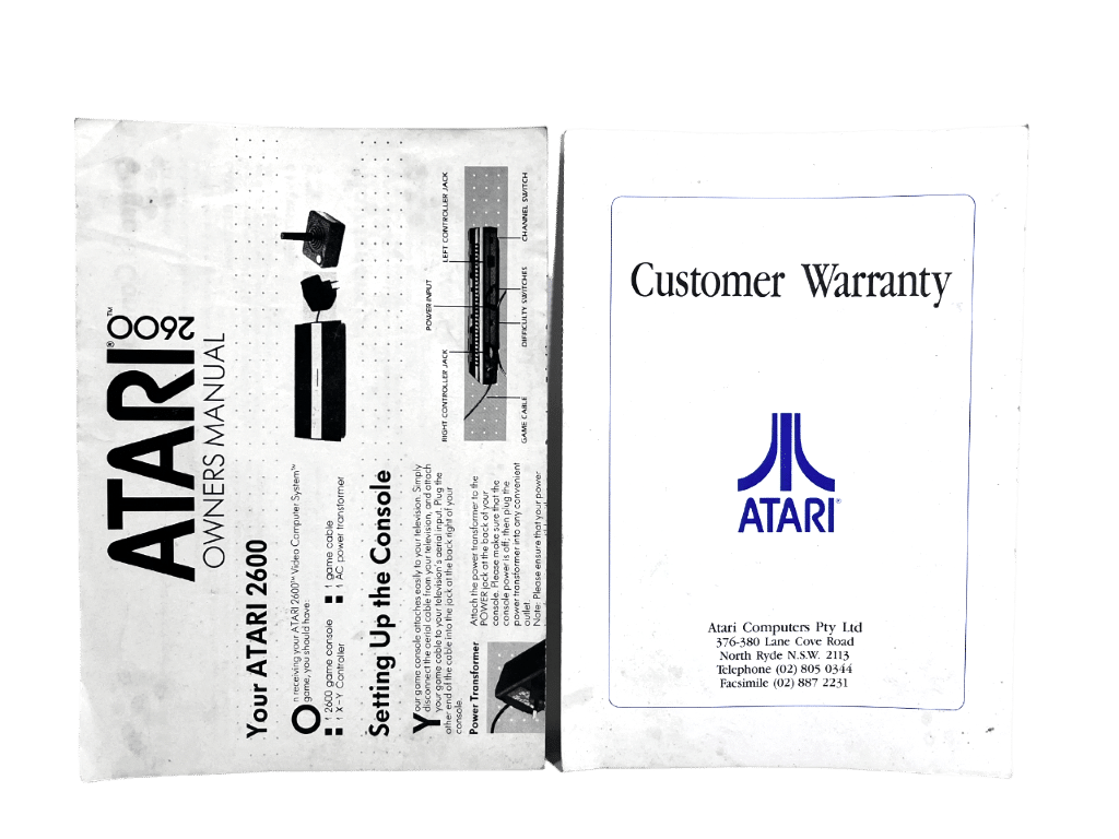 ATARI 2600 Retro Gaming Console Complete Playing Bundle: Console + Joystick (controller) + AC Power Adapter + TV Aerial connector lead + Original Instruction Booklet + Original Warranty dated 1988 – purchased New in 1988 from KMart in Australia! This preowned Atari 2600 is in good condition and has been tested on a CRT TV. Power pack has some wear and tear pictured, but is still operational. Joystick is sound. Refer images.