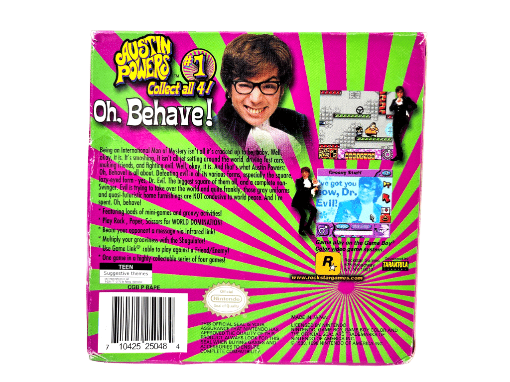 Austin Powers: Oh Behave! (Game Boy Color) *BOXED + COMPLETE*. This preowned Nintendo Gameboy Colour / Gameboy Color game features original box + inner contents – game cartridge + instruction manual. Internal contents are in very good condition and the outer box has some cardboard wear from storage as pictured. Refer photographs.