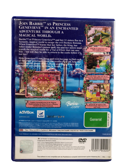 Rare Children’s PS2 game 100% complete with contents: BARBIE in the 12 Dancing Princesses for SONY PlayStation 2 / PS2. This preowned game comes complete with case, cover, manual / booklet, and game disc. Some light superficial markings / cosmetic scratches, but these are very minor imperfections which do not affect game play in any way.
