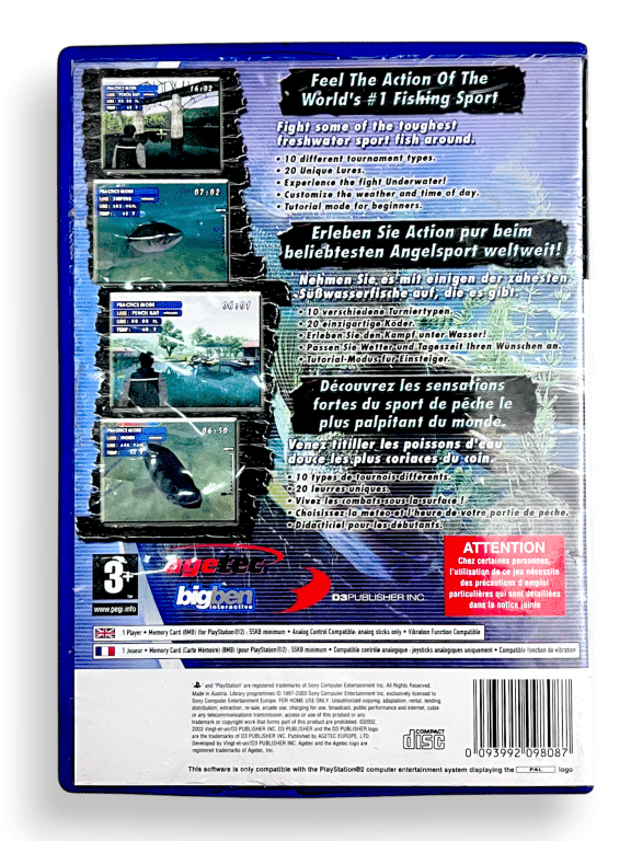 A classic PS2 freshwater fishing title featuring a range of lakes, authentic lures, and tournament-style challenges. Players cast, reel, and strategise to land trophy bass across varied environments, each with different weather and water conditions. Ideal for fans of calm, skill-based sports games and a nostalgic addition to any PlayStation 2 collection.