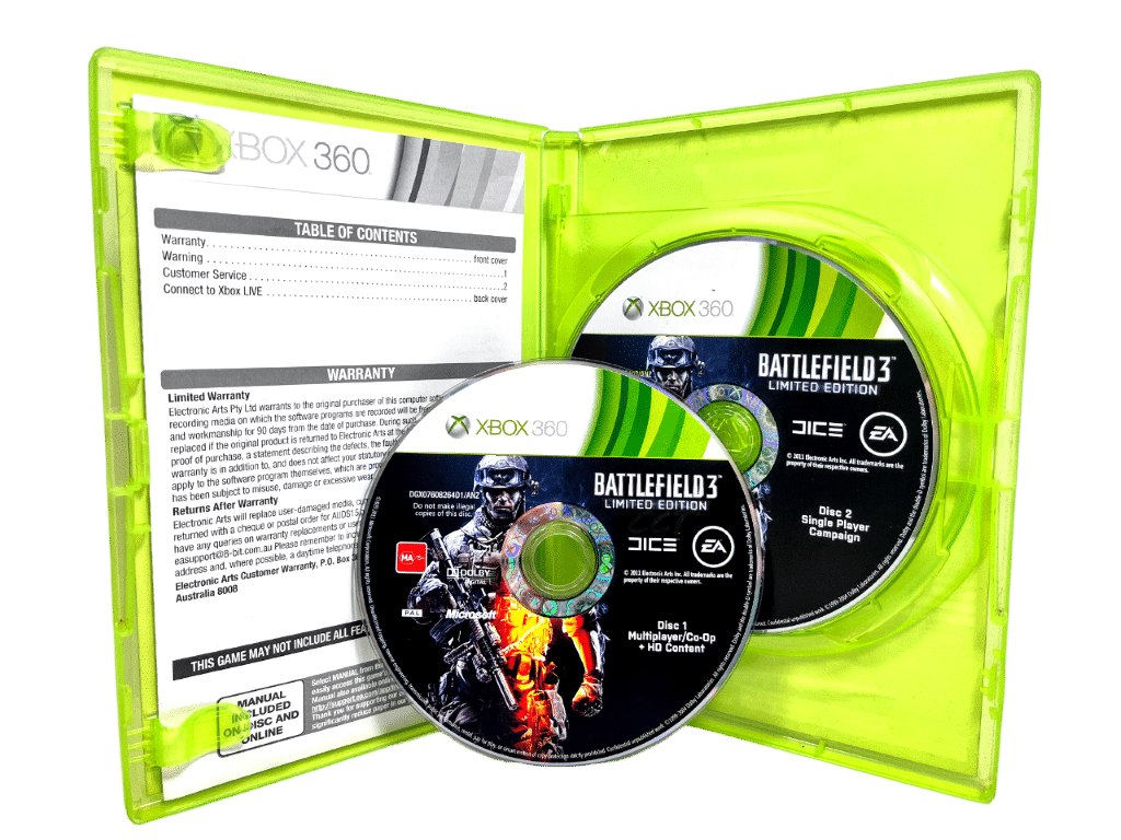 Rare Find: Excellent condition & 100% complete with AUTHENTIC LIMITED EDITION GAME DISCS: BATTLEFIELD 3 Limited Edition (BATTLE FIELD 3 LIMITED EDITION) for XBox 360. This preowned game is in superb condition and includes both manual / booklet + BOTH OFFICIAL LIMITED EDITION game discs inside case with Genuine Limited Edition cover.