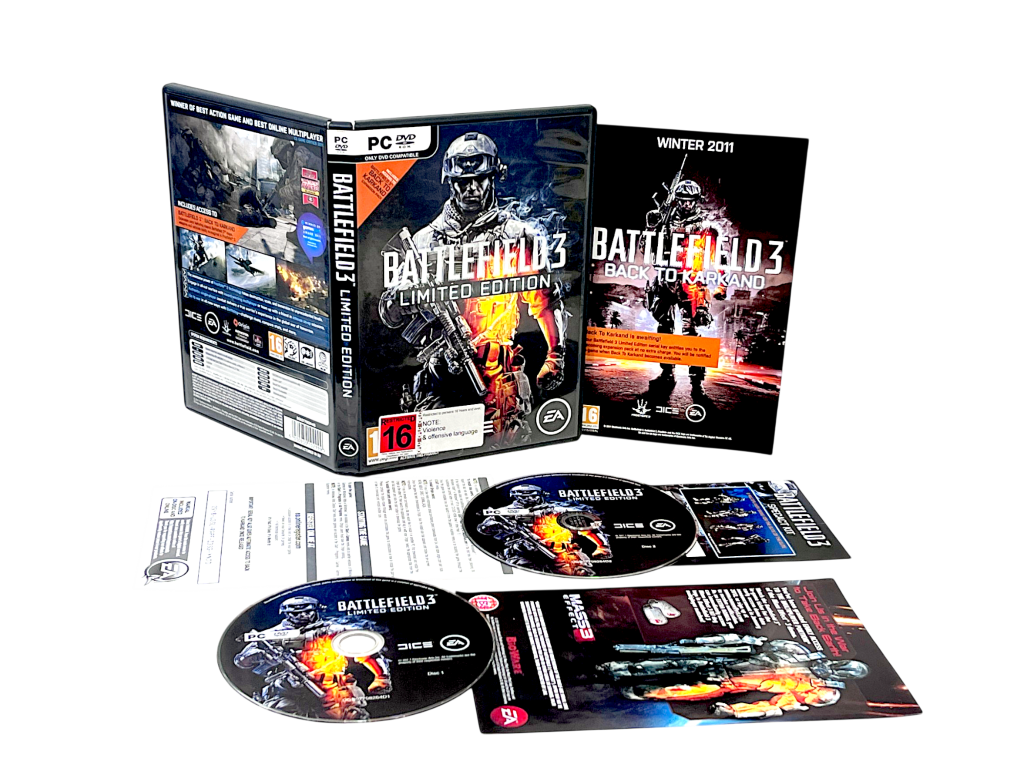 Battlefield 3 Limited Edition (PC DVD). This preowned PC DVD-Rom game is in excellent condition and includes pictured case + contents. Note that as a preowned PC game, this game may require a new keycode purchased online in order to unlock the game. A tidy and complete collector’s item. Refer photographs.