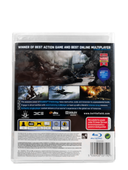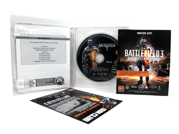 BATTLEFIELD 3 for SONY PlayStation 3 / PS3. This preowned game is in excellent condition and includes original case + cover + manual / booklet + game disc. Case has some minor plastic wear, but this is purely cosmetic, and the contents inside are very tidy.