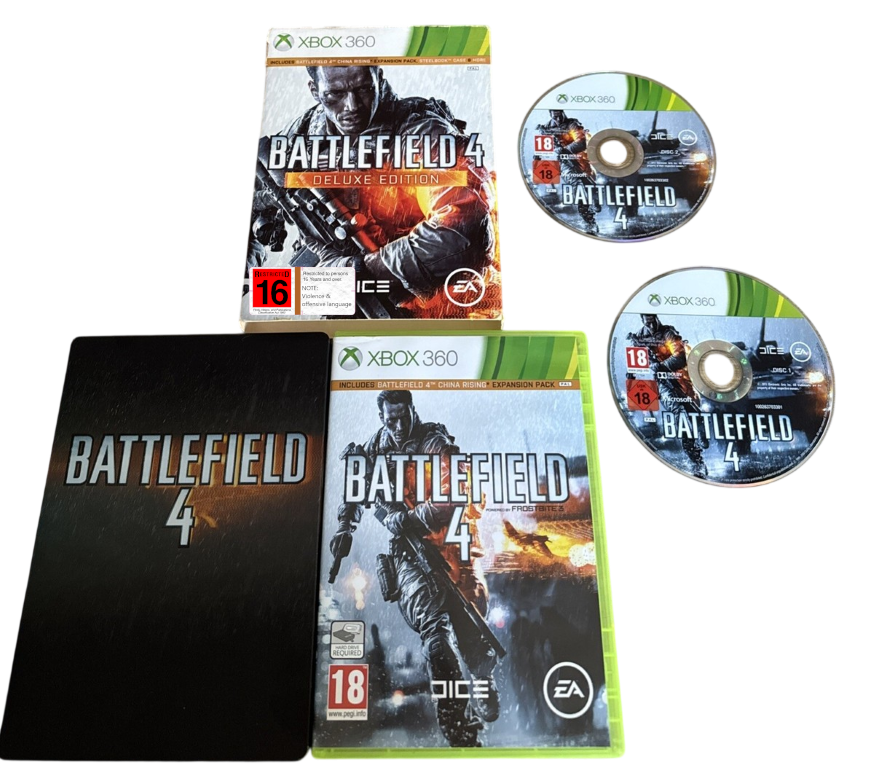 Battlefield 4 Deluxe Edition (Xbox 360) *BIG BOX STEEL EDITION*. This pre-owned Big Box Official Limited Release Steelbook Collector’s Edition features all internal contents in superb condition, as pictured in the rare external display box with just pictured light shelfware. A lovely collector’s bundle, refer photographs.