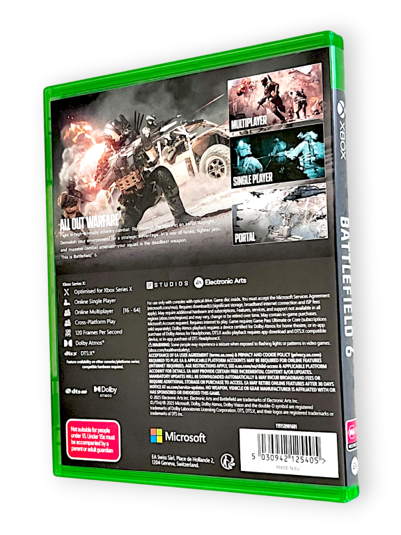 DESCRIPTION: Battlefield 6 delivers large-scale warfare with cutting-edge visuals and immersive multiplayer battles. Featuring expansive maps, dynamic weather effects, and intense vehicular combat, the game emphasises teamwork and strategic play. Players can engage in massive online battles, customise loadouts, and experience evolving battlefields that react to player actions. The game pushes the limits of next-gen hardware, offering smooth performance and detailed environments. Ideal for fans of competitive shooters, Battlefield 6 provides high-intensity action and replayability across multiple modes.