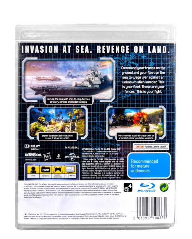RARE Strategy / Action / Shooter Game in Excellent Condition & 100% Complete with Contents: BATTLESHIP The Video Game / Battle Ship The Videogame for SONY PlayStation 3 / PS3. This preowned game is a very tidy collector’s item, and comes complete with case, cover, manual / booklet, and game disc.