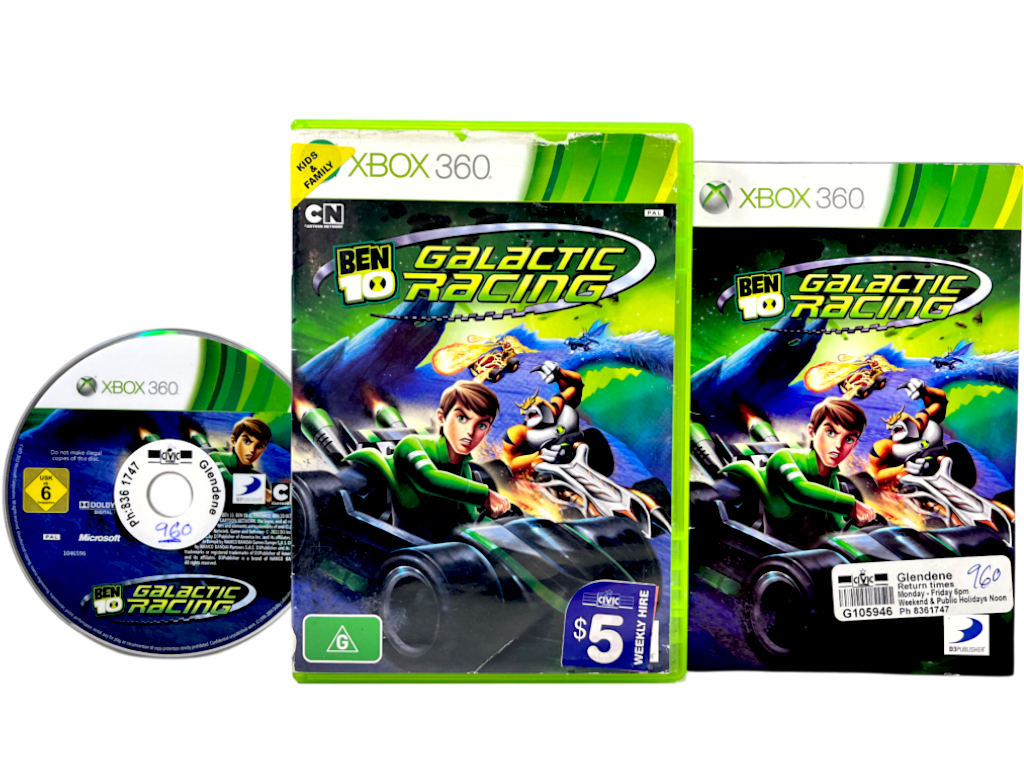 BEN 10 GALACTIC RACING / Ben Ten Galactic Racing for Xbox 360. This preowned game comes complete with pictured case + cover + manual / booklet + game disc. Some light superficial markings / cosmetic scratches, but these are very minor imperfections which do not affect game play in any way. Ex-rental game.