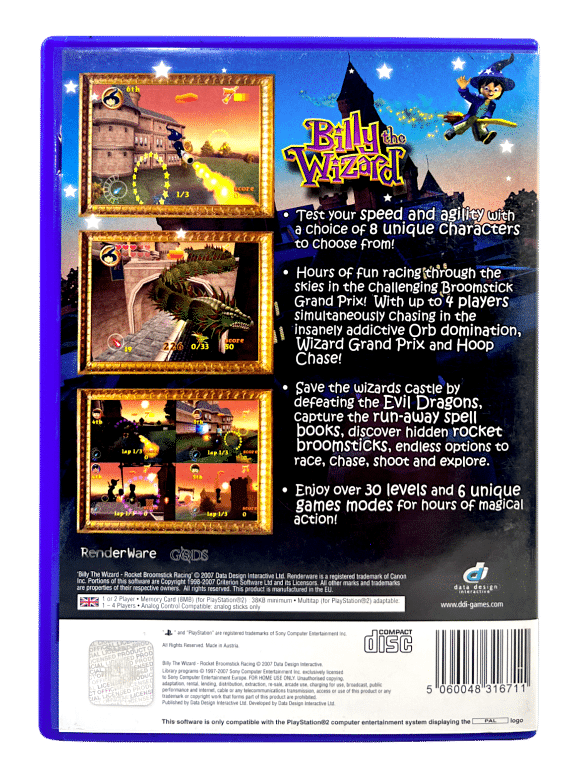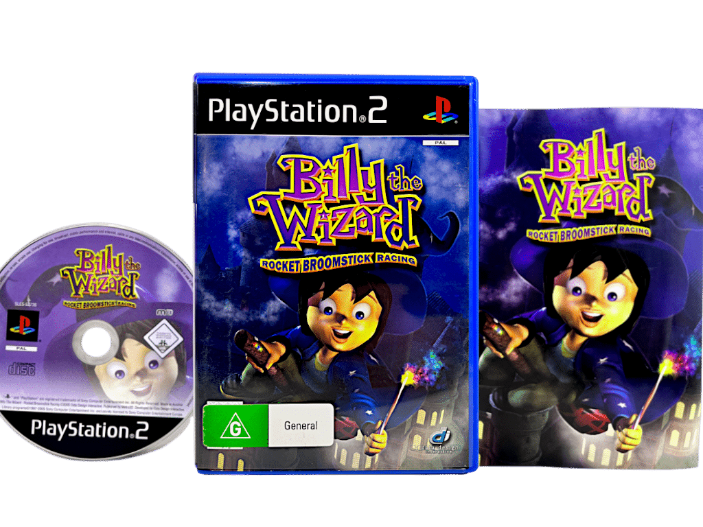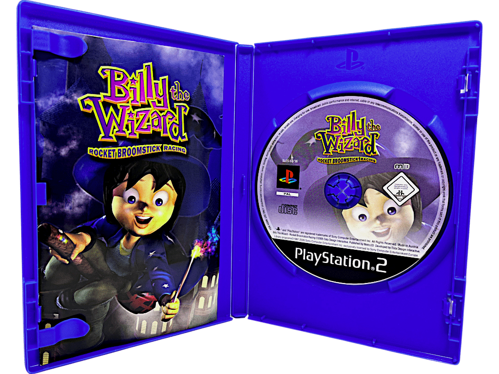 Excellent condition & 100% complete with contents: Billy the Wizard Rocket Broomstick Racing for SONY PlayStation 2 / PS2. This preowned game is in superb condition and comes complete with case + cover + manual / booklet + game disc. Overall, a tidy and complete collector’s item.