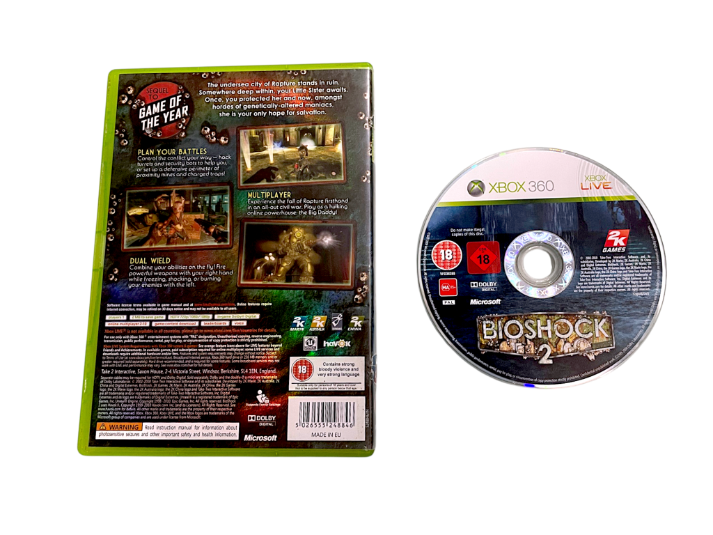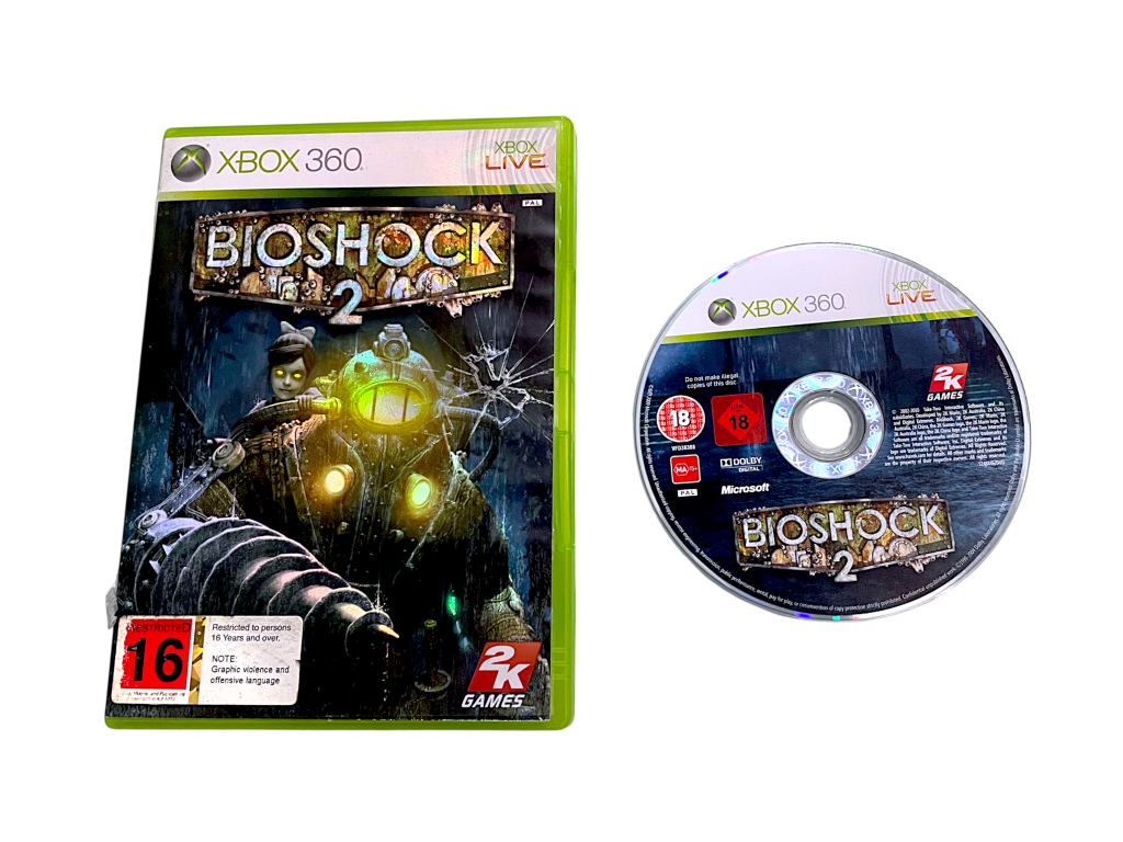 BioShock 2 (Xbox 360). This pre-owned game is in good condition with mild disc surface imperfections only which do not hinder gameplay or performance in any way. This game includes the pictured case and contents. Refer to the photographs.