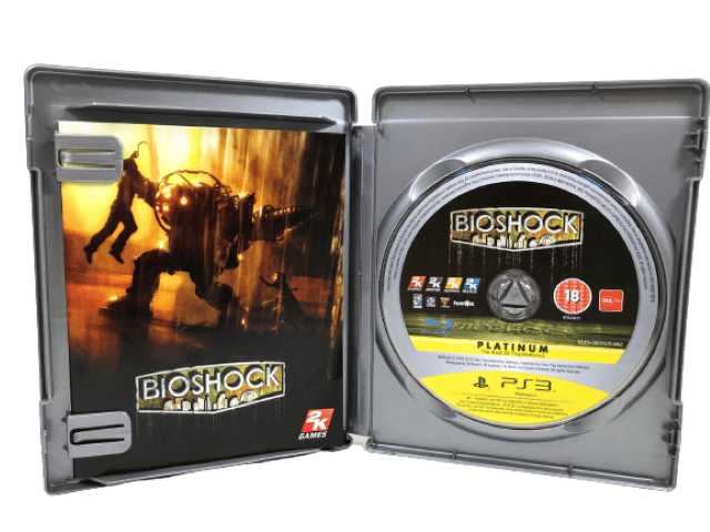 Good condition & 100% complete with contents: BOISHOCK – GENUINE PLATINUM EDITION – for SONY PlayStation 3 / PS3. This preowned game comes complete with case, cover, manual / booklet, and game disc. Case has some laminate plastic wear, but this is cosmetic only, and the internal contents (game disc + manual) are each in excellent condition.