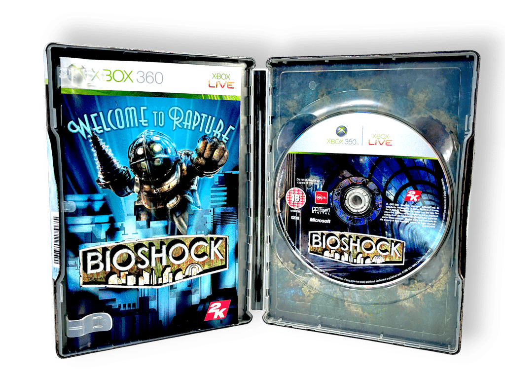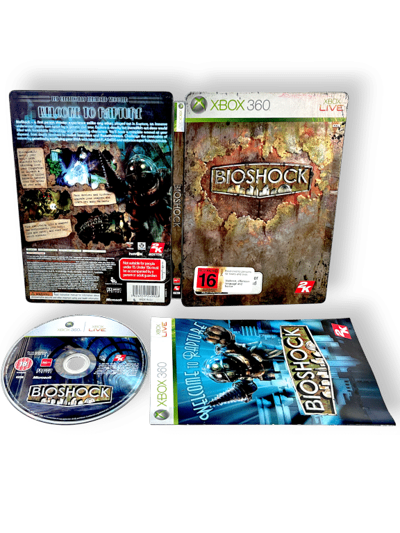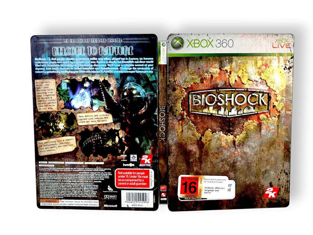BioShock (Xbox 360) *STEEL COLLECTOR’S EDITION*. This pre-owned authentic limited release steel book collector’s edition is in excellent condition. Each of the contents inside are fantastic, and the external steel case has just some cosmetic ageing spots consistent with time. Refer photographs.
