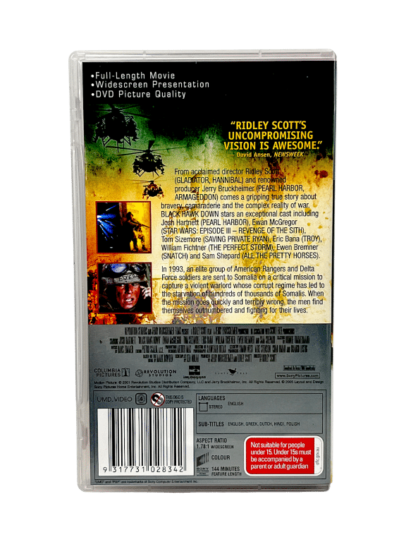 Black Hawk Down (UMD Video for PSP). This pre-owned Sony PlayStation Portable (PSP) movie is in excellent condition and Comes complete with case, cover, and miniature movie disc inside its plastic UMD casing. A tidy and complete collectibles item, refer photographs.