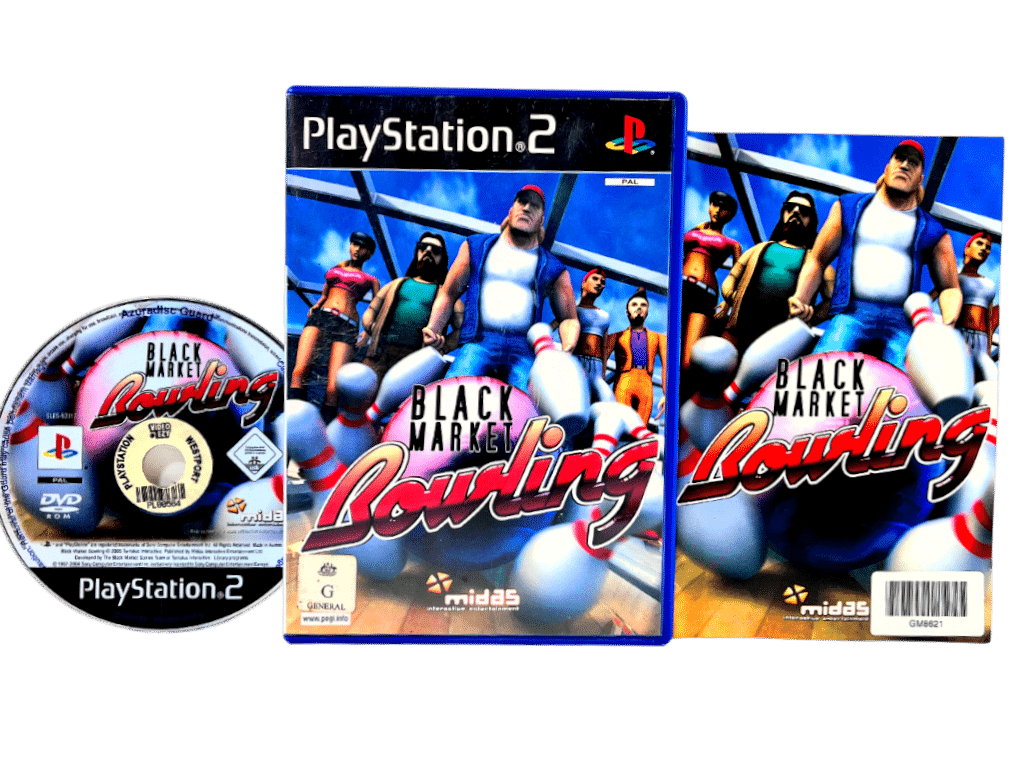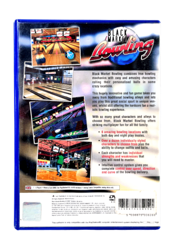 Good Condition & 100% Complete with Contents: Black Market Bowling for SONY PlayStation 2 / PS2. This preowned game comes complete with case + cover + manual / booklet + game disc. Some light superficial markings / cosmetic scratches, but these are very minor imperfections which do not affect game play in any way.