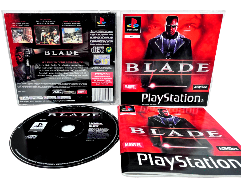 The Original Print (non-Platinum) in Excellent Condition & 100% Complete with Contents: BLADE Official Video Game for SONY PlayStation / PS1. This preowned game is in superb condition and comes complete with case + covers (both front & reverse cover slips) + manual / booklet + game disc. A tidy and complete collector’s item.