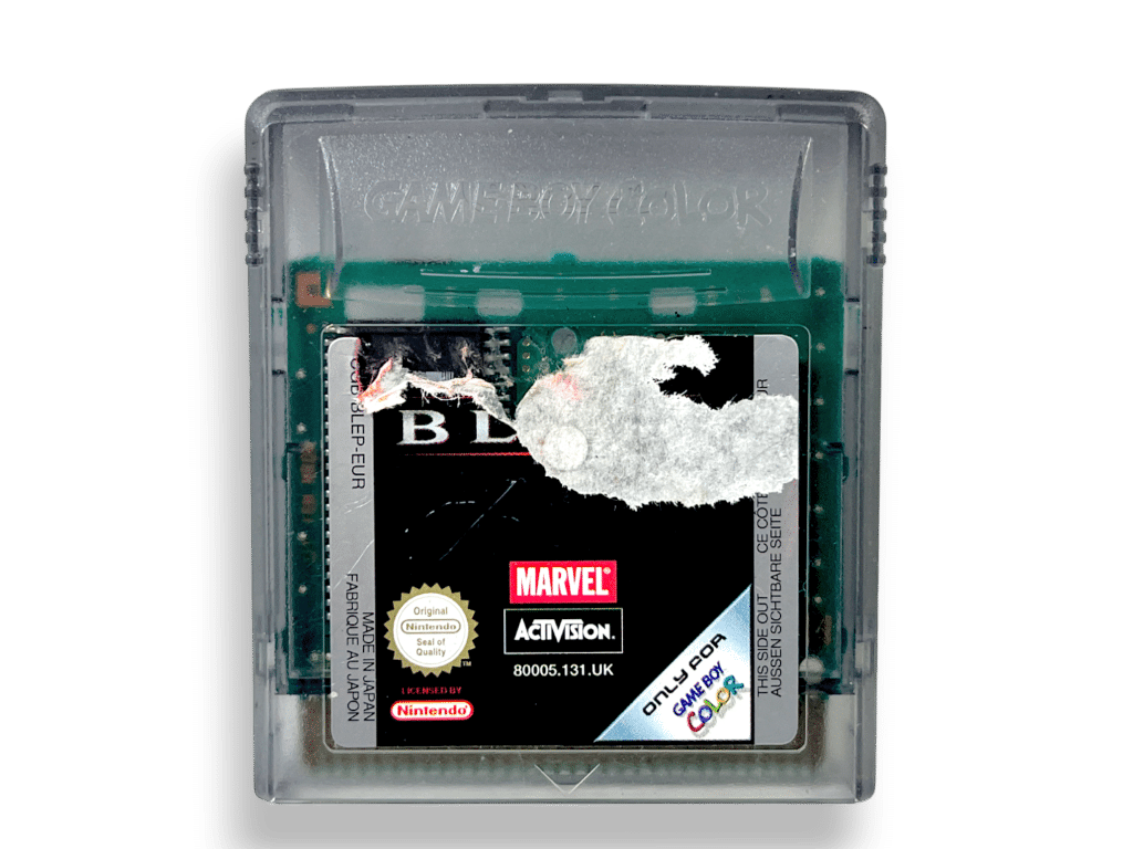 Blade for the Game Boy Color is a side-scrolling action game released in 2000, based on Marvel’s iconic vampire hunter and the hit movie adaptation. Players step into the role of Blade, a half-human, half-vampire warrior who wields an arsenal of weapons to take on bloodthirsty enemies and supernatural threats. Armed with a sword, firearms, and martial arts skills, Blade must fight his way through challenging levels filled with vampires, mutants, and bosses. The game delivers fast-paced combat on the go, making it a must-have for fans of Marvel’s darker heroes and retro handheld action games.